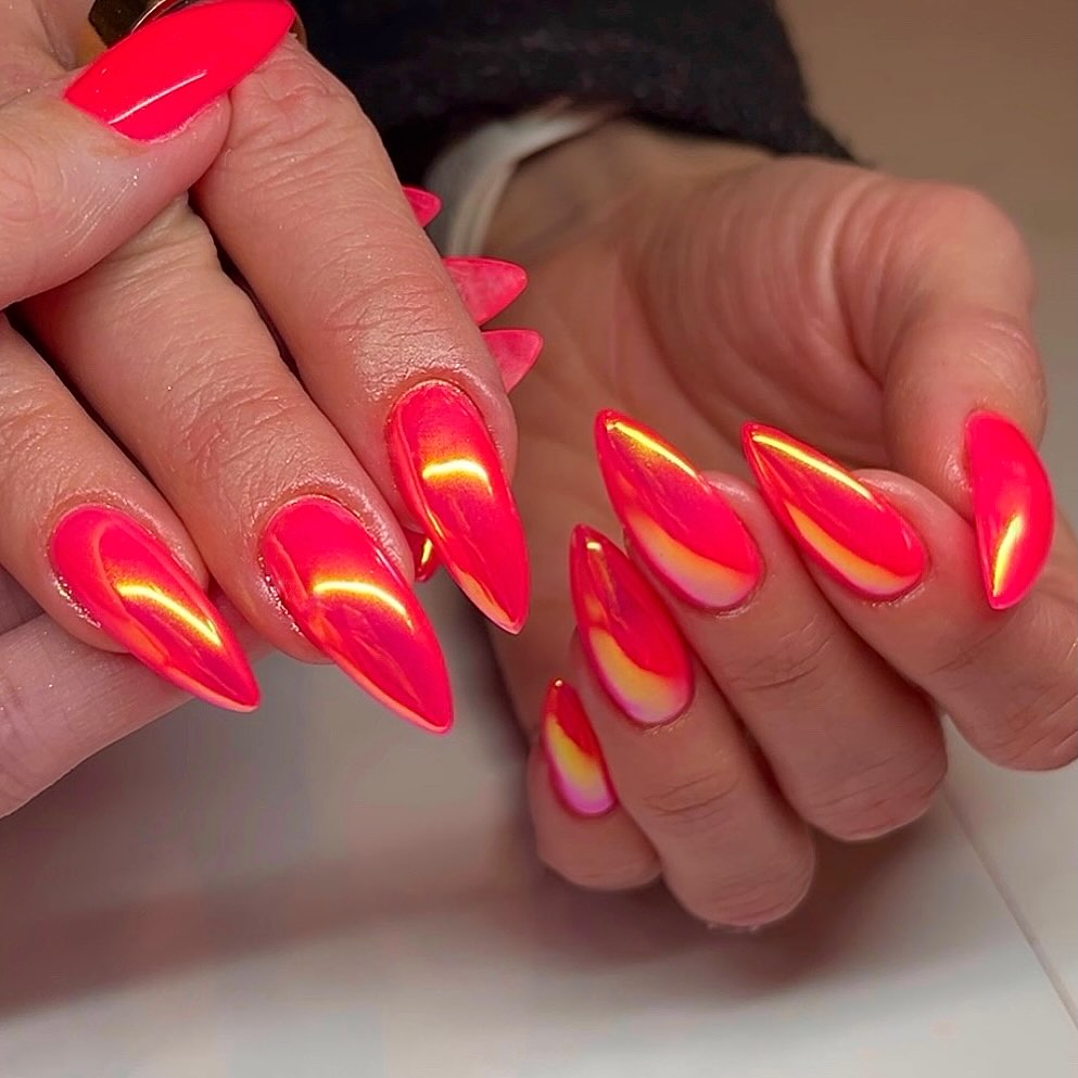 This neon coral chrome manicure is a striking choice for those seeking a dramatic look. The sharp stiletto shape instantly elongates the fingers, while the ultra-reflective chrome finish creates a molten, almost liquid-metal effect. The subtle flame-like gradient in yellow and pink tones gives the design depth and movement, making it impossible to ignore.