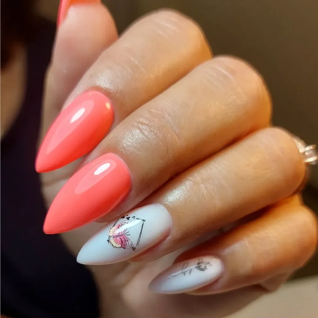 This design feels romantic and softly feminine. The glossy coral almond nails bring warmth and a gentle, bright glow, while the milky white accent nails feature delicate butterfly artwork framed in fine black lines. It’s subtle, sweet, and beautifully balanced.