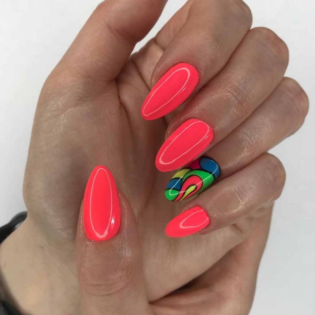 This playful coral look feels like a little vacation on your fingertips. The glossy, almost Pink-leaning neon base is cheerful and fresh, while the single abstract Art accent nail adds personality without overwhelming the overall design. It’s Cute, modern, and just a bit unexpected—exactly what spring should feel like.