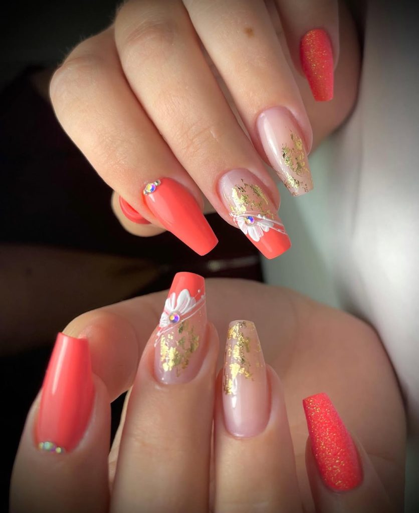 Soft coral paired with a translucent nude base feels elegant and romantic at the same time. The delicate artwork, with flowers and touches of gold foil, creates a layered look that feels thoughtfully curated. It’s the kind of manicure that catches attention quietly—subtle, feminine, and very 2026.