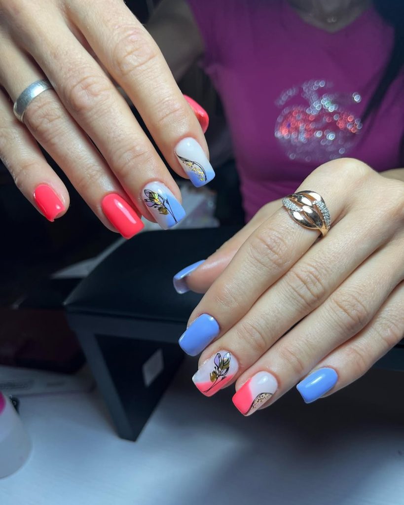 This playful combination of coral and soft blue evokes the essence of springtime. The glossy coral nails bring bright, cheerful energy, while the blue accents and delicate floral Art details add dimension and personality. It’s lively, feminine, and full of ideas for those who love a little creativity in their manicures.