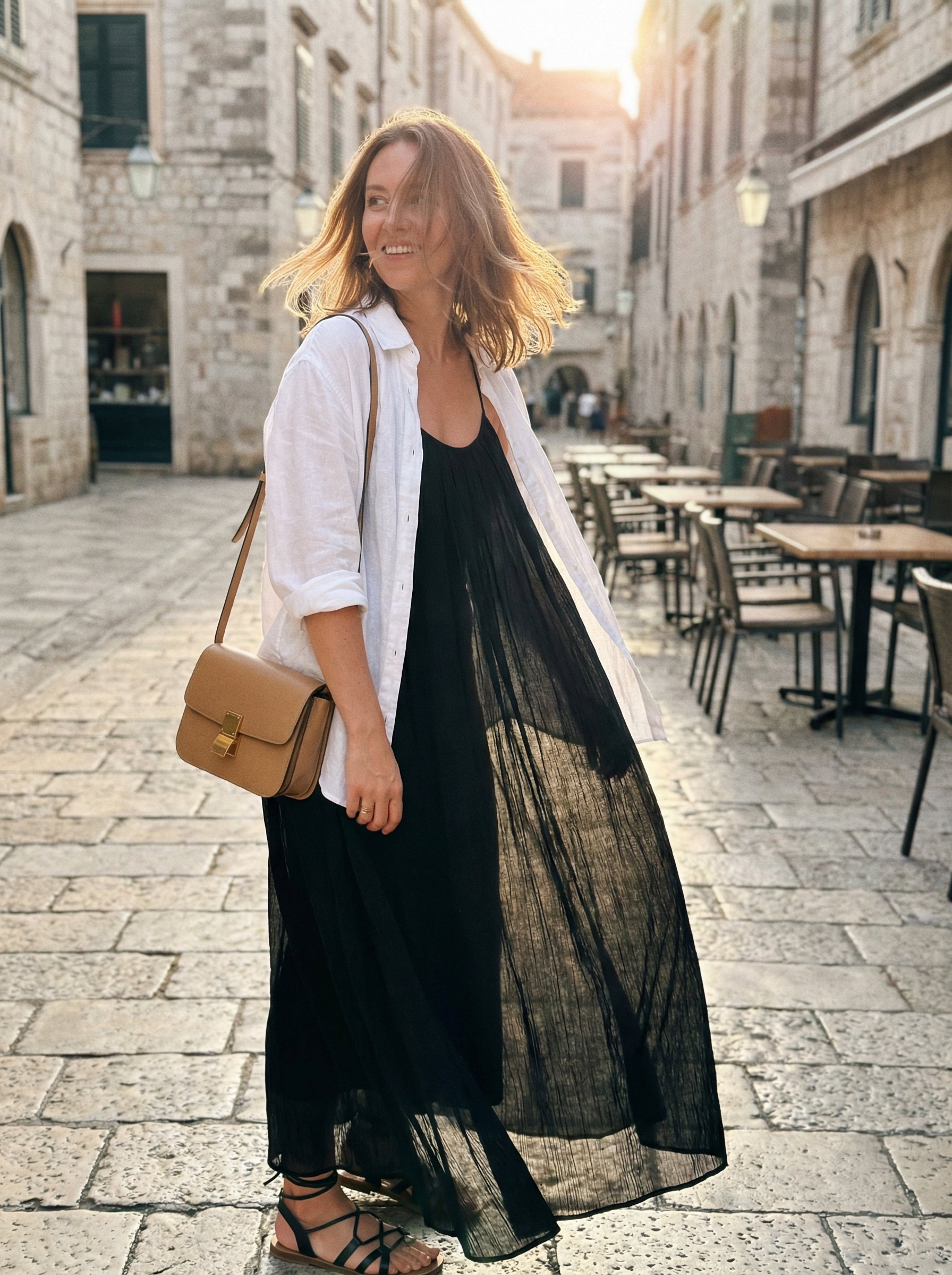 An easy yes. For days that blend cultural trips with social evenings, this combination of a black maxi dress and a white button-down is the epitome of classy resort wear. The outfit felt perfectly appropriate transitioning from quiet gallery halls to a bustling aperitivo bar. However, this look is more for sophisticated strolling and sitting, so you should skip it if your day involves lots of walking.