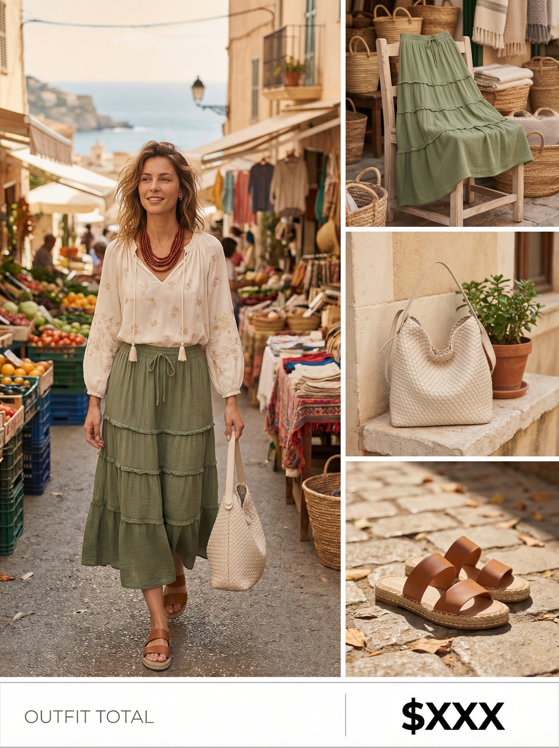 This look embodies the perfect blend of comfort and style for any sun-drenched outing, making it ideal women’s clothing for a beach vacation. The outfit is grounded by an olive green tiered skirt, priced at $27.30, crafted from a light cotton gauze. Its tiered construction adds romantic, flowing movement with every step. Paired with a cream peasant blouse, the ensemble is completed with a soft, unstructured woven bag in a natural beige for $94.99, enhancing the overall bohemian aesthetic. The harmonious colors—olive, cream, and brown—create a relaxed, earthy vibe fit for a market stroll or a walk along the shore.
