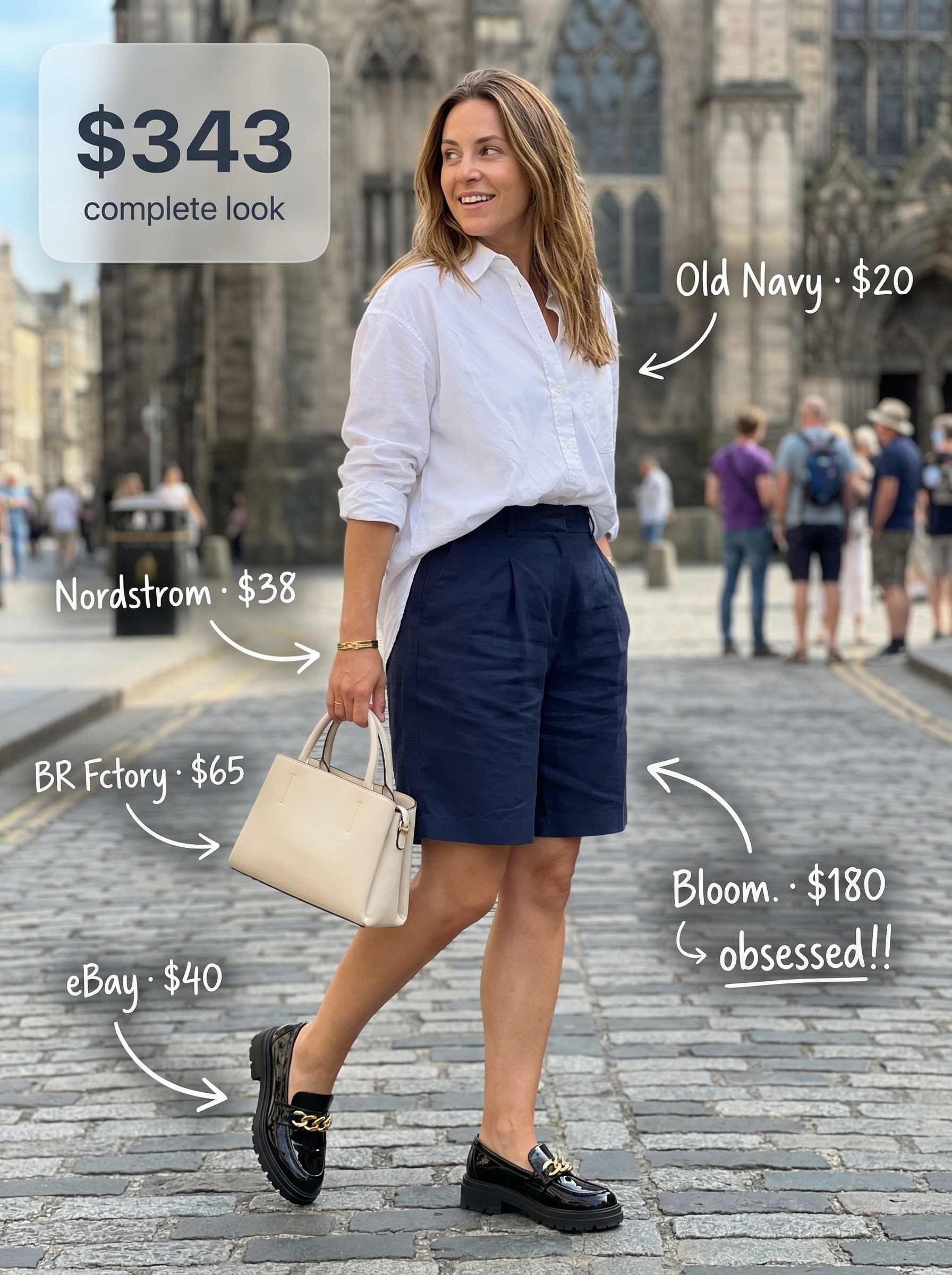 This classic navy and white pairing creates one of the most timeless outfits for summer vacation you can pack. The look combines an oversized white cotton poplin top ($19.99) with sophisticated navy blue pleated Bermuda shorts ($180). The longer length of the shorts offers a refined silhouette, while the linen-blend fabric is chosen for its breathable quality in warmer city environments. Tucking the button-down into the shorts and adding a slim belt can create an even more elevated look for an upscale lunch or museum visit.