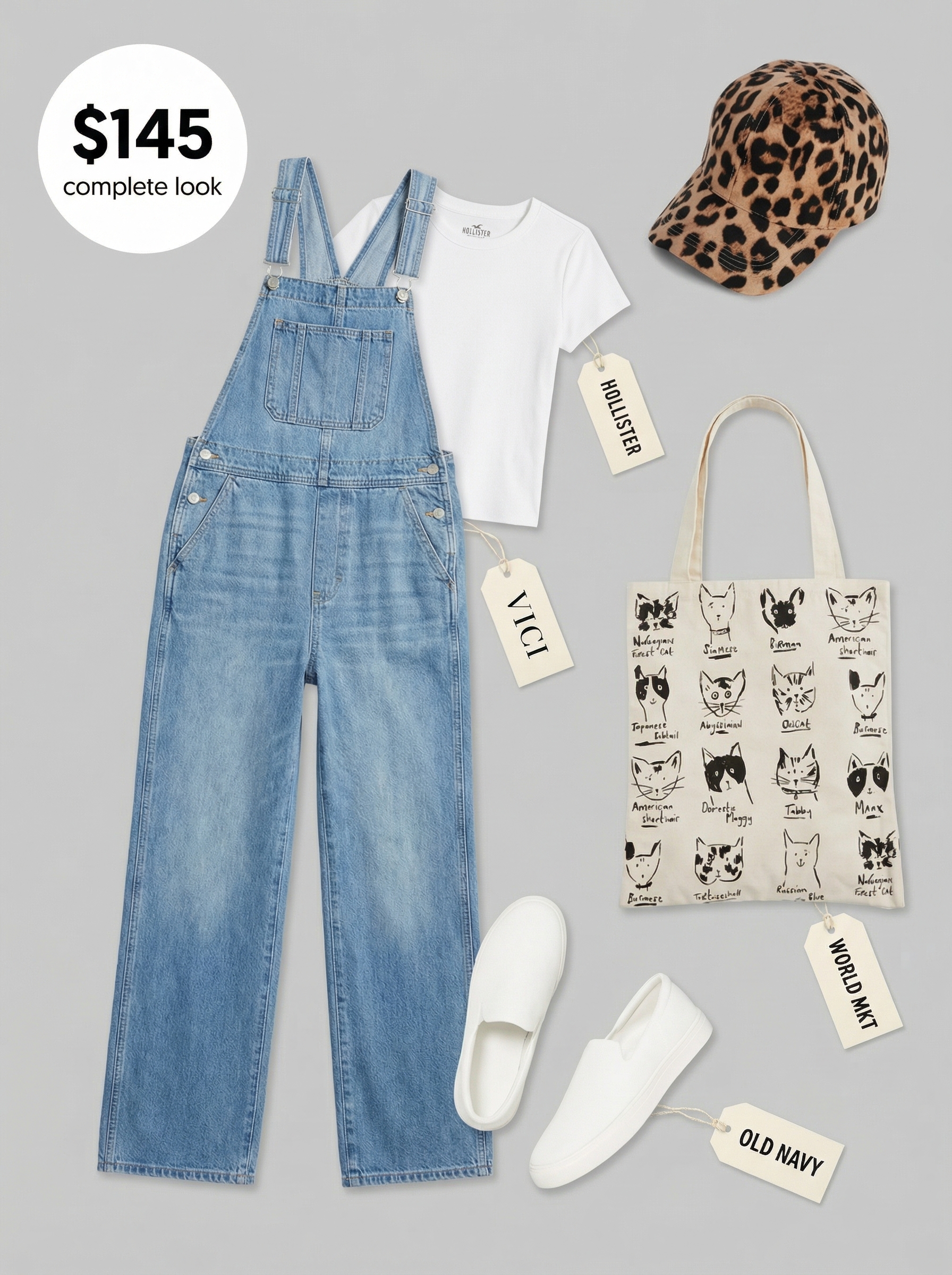 This effortless look is perfect for casual coffee runs and one of our favorite vacation summer outfits. The hero piece is a pair of medium-wash cotton denim overalls ($66), which provide a sturdy yet comfortable foundation. Layered over a simple white tee and paired with white slip-on sneakers, the outfit feels both playful and practical. A leopard print accessory, like this baseball cap ($38), adds an unexpected pop of pattern that elevates the entire ensemble from basic to trendy, while a graphic tote offers personality and function.