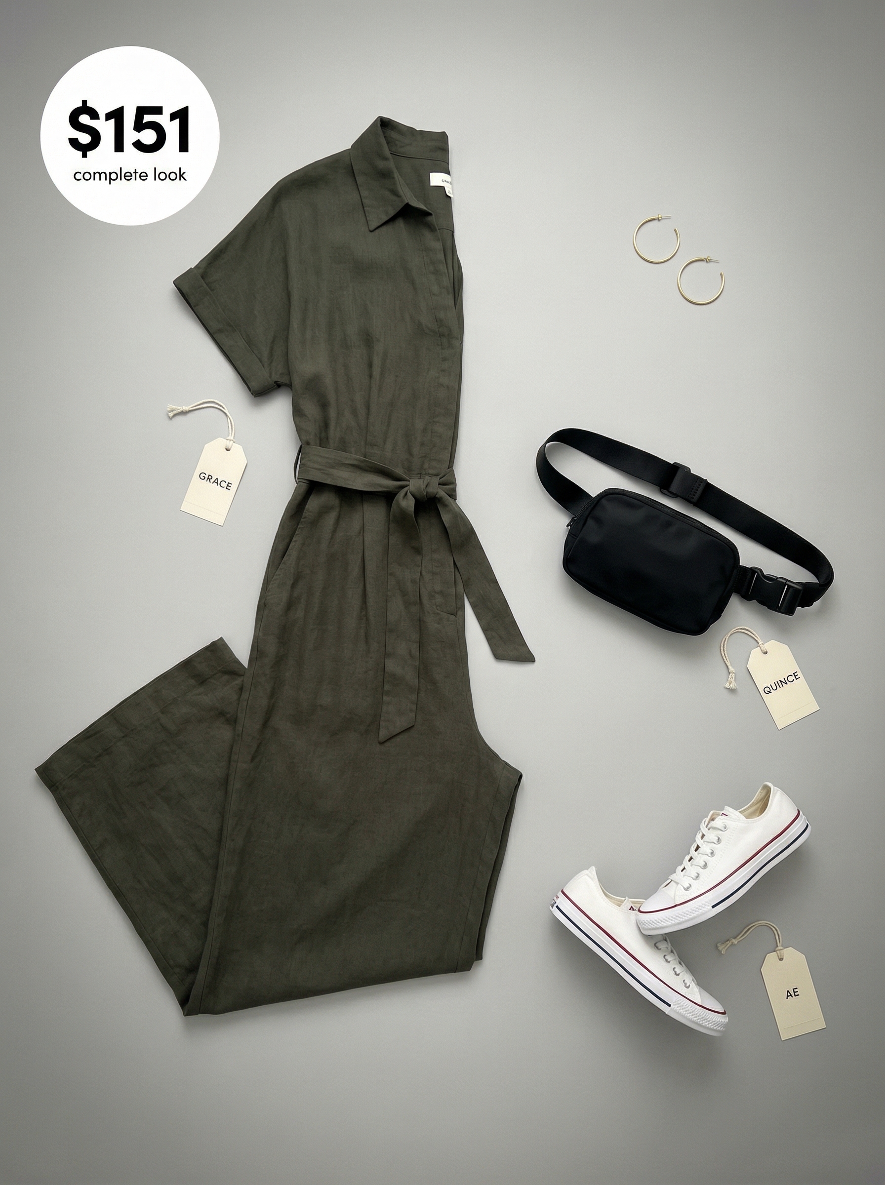 And if you need more casual vacation outfits for ladies, this day trip look is another one-and-done hero. The outfit centers on an olive green jumpsuit made from a Tencel blend, which is styled for city exploration with comfortable white canvas shoes ($60) and a practical black nylon belt bag ($26). The accessories are thoughtfully chosen; the sneakers provide comfort for a full day of walking, while the hands-free bag keeps your essentials secure and accessible.