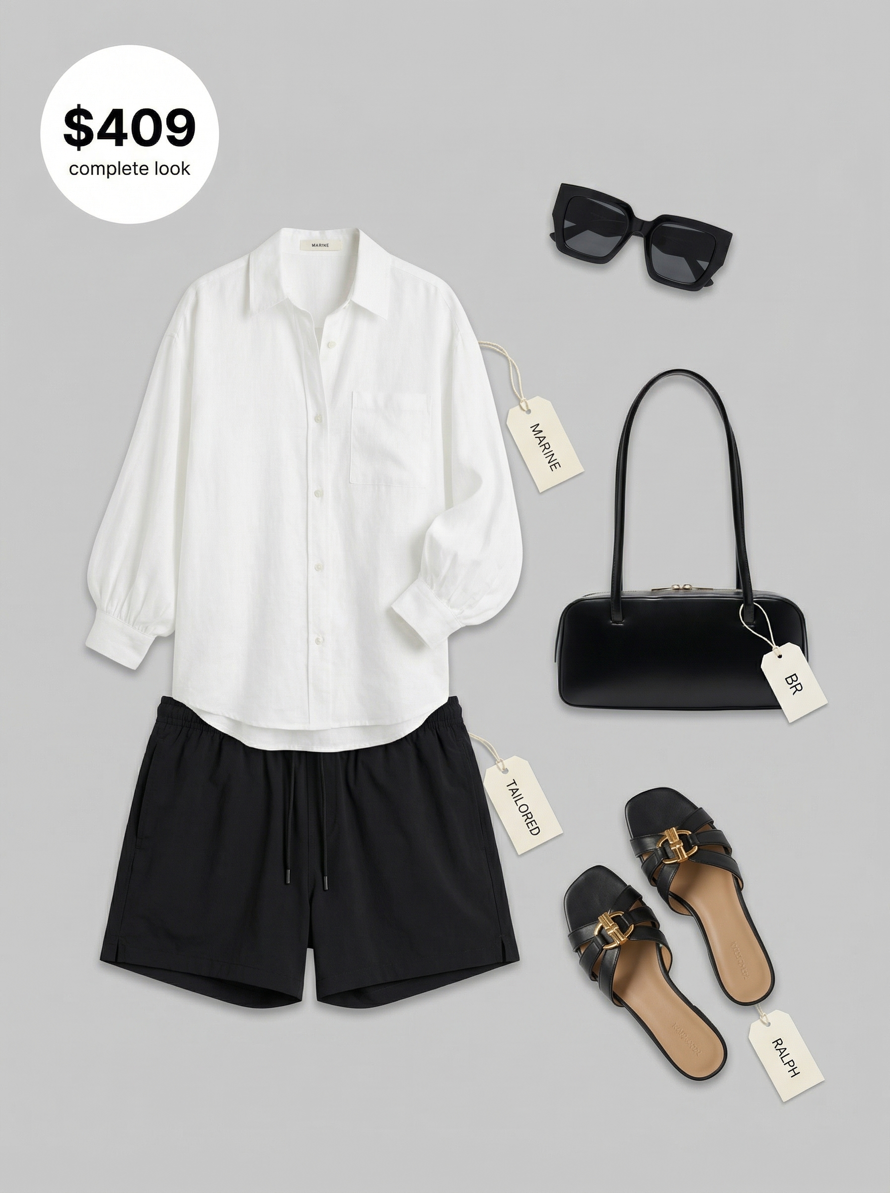 The secret to sophisticated, classy resort wear lies in elevated basics. This look centers on chic black swim shorts paired with an oversized white linen-blend top ($110). The ensemble is pulled together with elegant black Nappa leather slides featuring a gold buckle detail, costing $145. The black-and-white palette feels timeless and luxurious, perfect for a beach club or resort lunch. During testing, the shorts dried completely within 15 minutes of getting splashed, making them highly practical for poolside lounging.