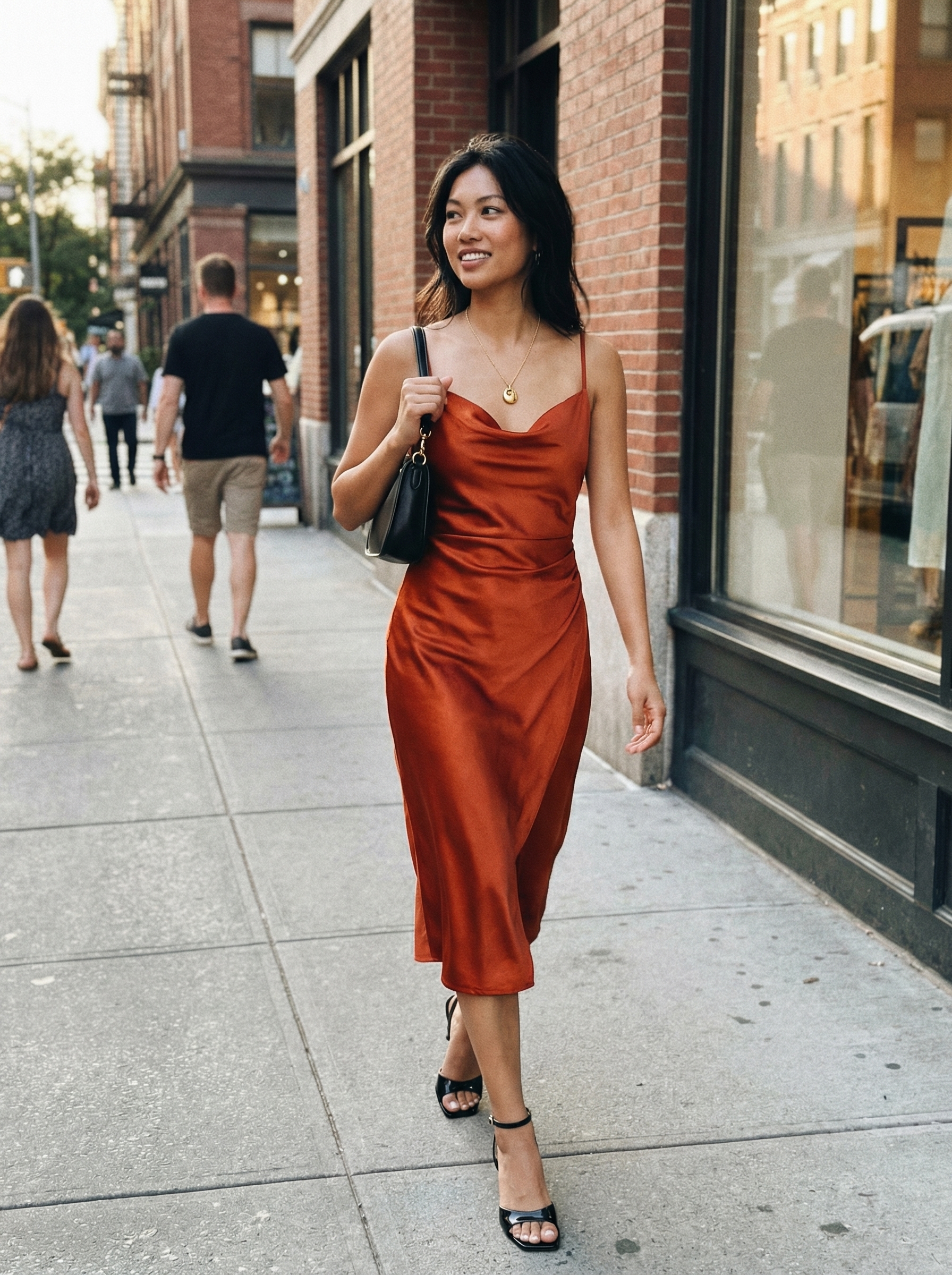 Once the sun sets, trade the carry-all for something sleeker. This luxurious outfit is built around a stunning copper-colored charmeuse satin dress ($37), whose cowl neckline drapes beautifully to create an elegant silhouette ideal for a special evening. The midi-length slip dress moves gracefully and has a rich sheen that catches the light. To complete the look, a classic black leather shoulder bag ($195) provides a sophisticated contrast, while minimal gold jewelry complements the warm tone of the dress.