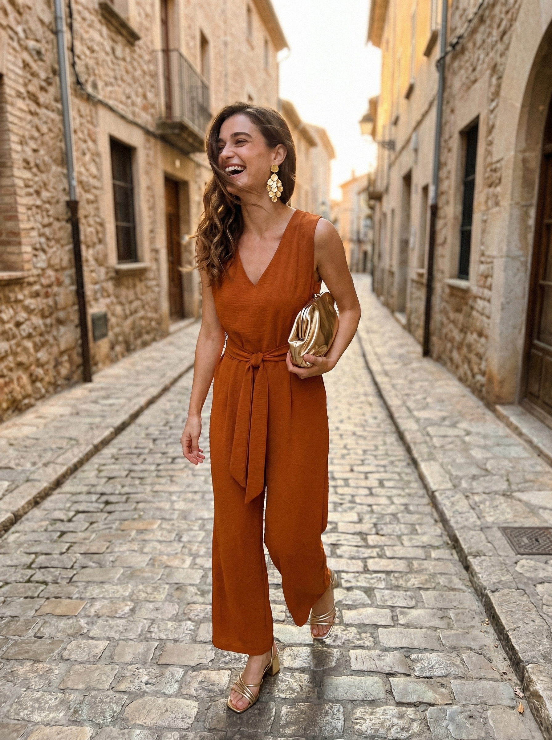 This deep terracotta jumpsuit creates sophisticated and classy vacation outfits perfect for a glamorous dinner date or evening cocktail event. Its crepe fabric is a key feature; we tested it and found the material didn’t wrinkle or feel restrictive even through a two-hour seated dinner, which makes it ideal for travel. The V-neck and wide-leg silhouette is flattering and comfortable, while the self-tie waist accentuates the figure for a polished finish, all for just $36.99. The look feels complete when styled with metallic gold accessories, like statement earrings and a clutch, to elevate the glamorous mood. For a final touch, wear your hair in soft waves to highlight the jumpsuit’s neckline.