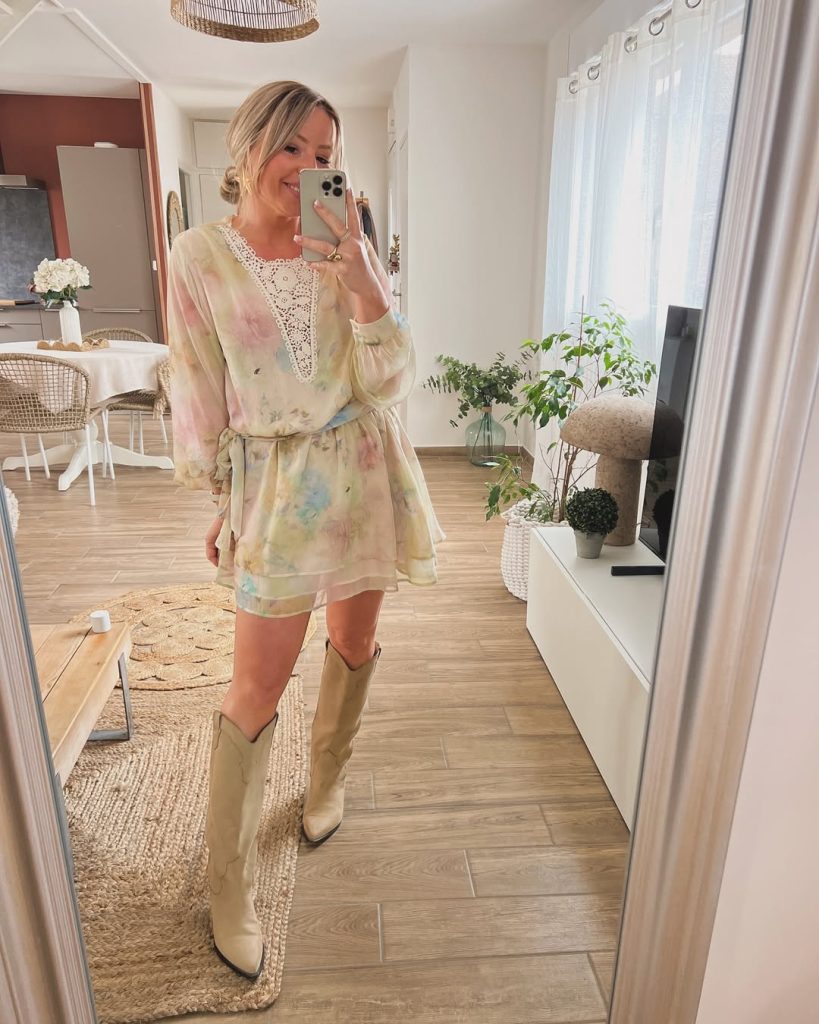 A soft, breezy Cute mini dress in pastel watercolor tones, lifted by lace accents and finished with light Western charm.