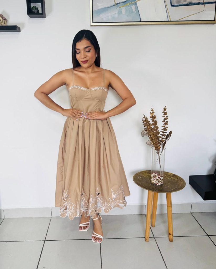 Perfect for seaside dinners, rooftop cocktails, or formal summer events. Add a light shawl in white or champagne for cooler nights. Avoid bulky cardigans—they hide the beautifully sculpted neckline. To add personality, choose a bold red lip or pearl studs for a more classy finish.