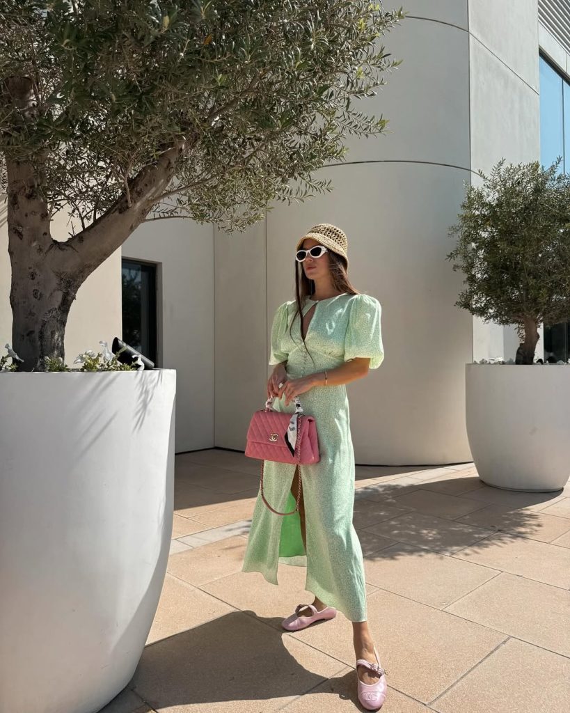 This look fits beautifully into spring brunches, weekend outings, or a relaxed backyard gathering. A casual crossbody in brown leather adds warmth without overwhelming the dreamy palette. Avoid heavy jackets; instead choose a light, white cardigan or denim layer for cooler days. It’s the kind of outfit that naturally brightens a room, perfect for someone who loves soft, feminine pieces that still feel effortless.
