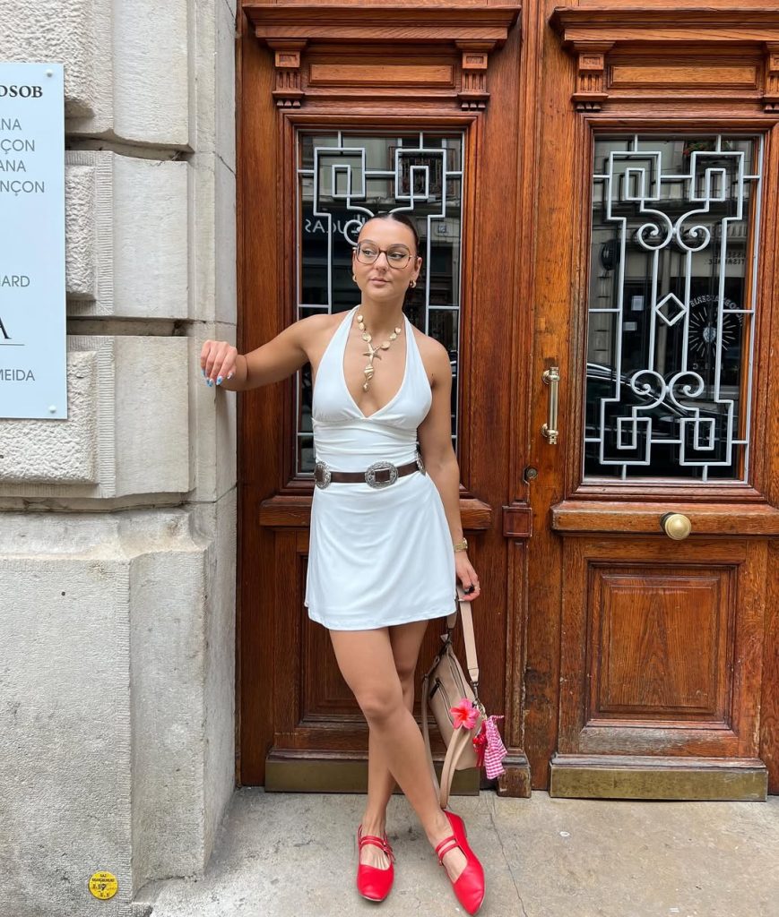 A bright and summery white mini dress with a halter neckline, styled with bold pops of color and metallic Western accents.