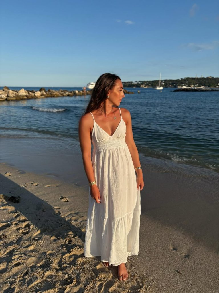 A soft, free-flowing white maxi dress that captures the golden calm of sunset strolls along the shoreline.