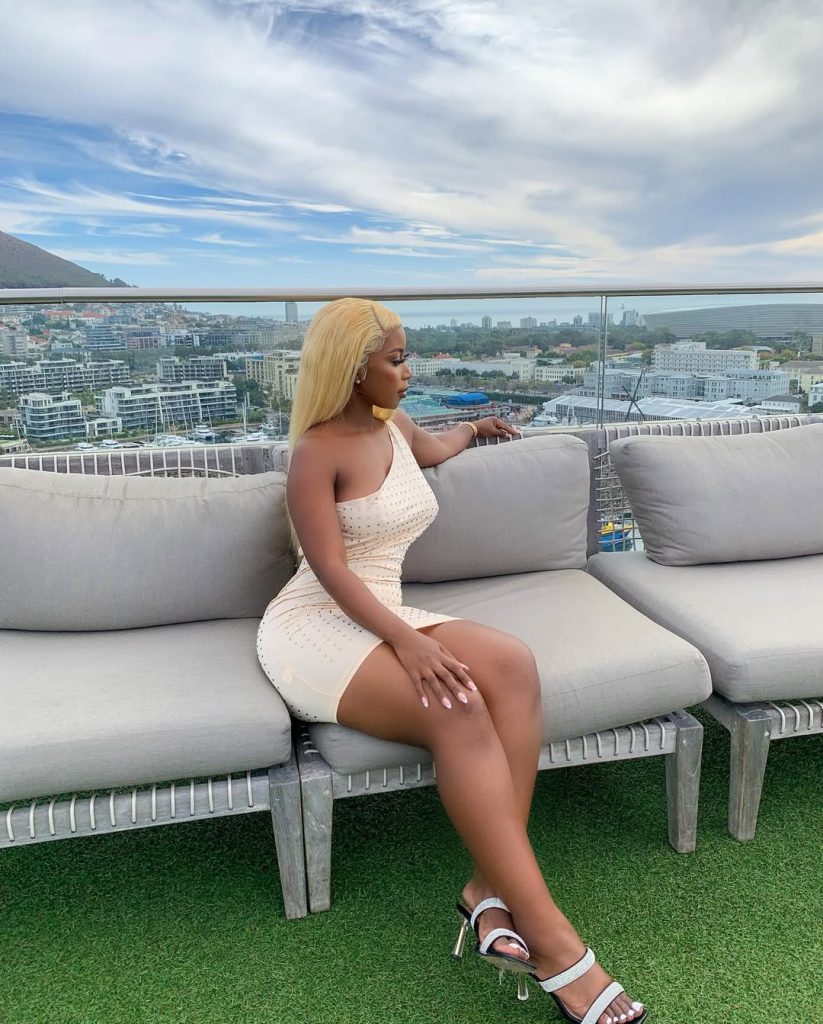 A polished rooftop moment comes to life through a sleek, studded bodycon silhouette in soft beige—modern, sculpted, and ready for nights filled with skyline views.