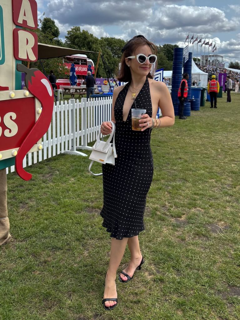A black midi dress with a halter neckline, whimsical polka dots, and a modern contemporary fluted hem, giving a hint of nostalgic charm and ideal for festival days or outdoor events.