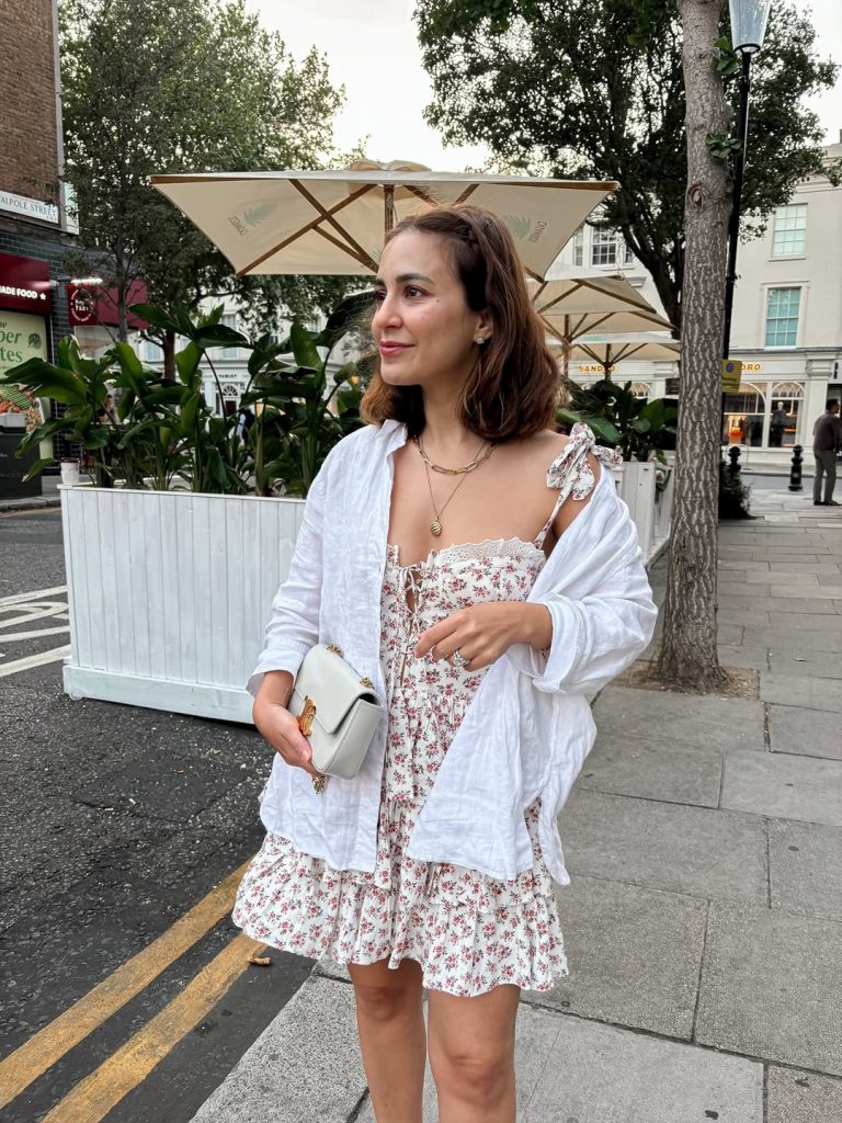 A gentle floral mini dress layered with a lightweight linen shirt provides some nice charm and a relaxed look, ideal for lovely warm evenings.