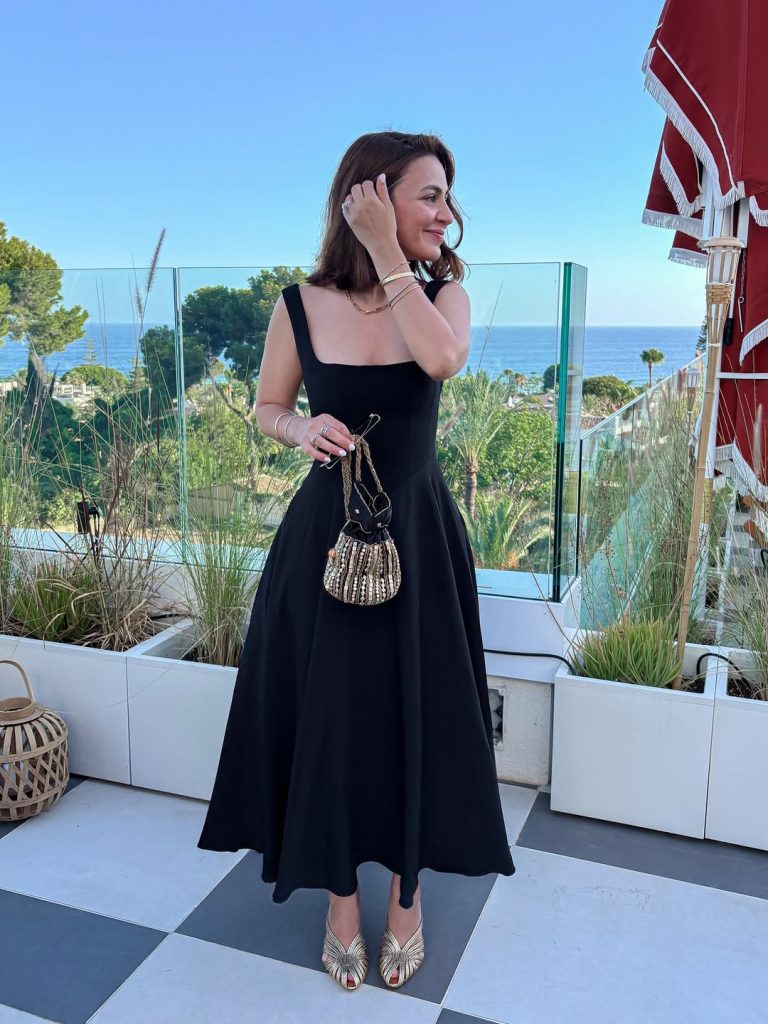 A refined black A-line midi dress that channels timeless elegance, elevated with golden accents and a soft coastal backdrop.