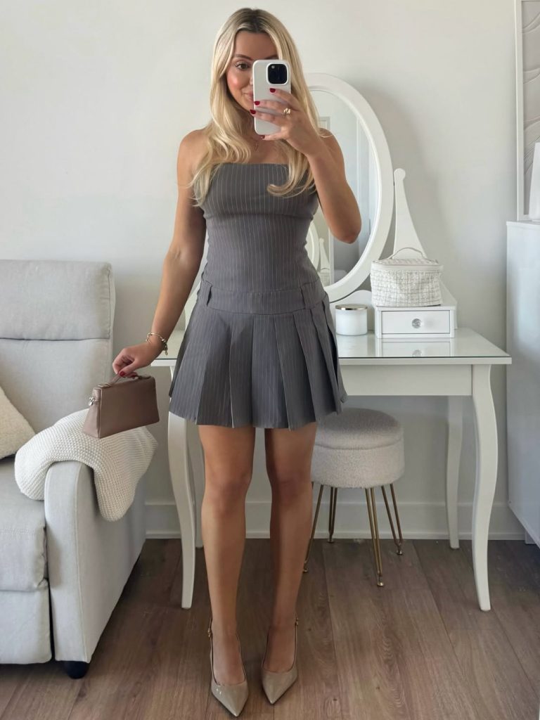 A structured and modern gray mini dress with fine tailoring, giving the look a polished twist that blends city chic with youthful charm.