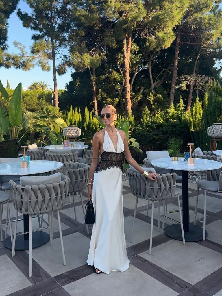 A sophisticated halter maxi dress where soft white satin contrasts beautifully with dramatic black lace, creating a bold evening silhouette.