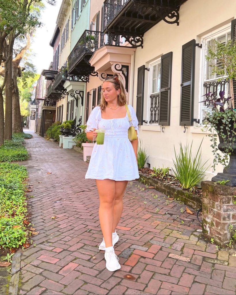 A fresh and youthful white mini dress with puff sleeves, styled with sneakers for a breezy, approachable summertime look.