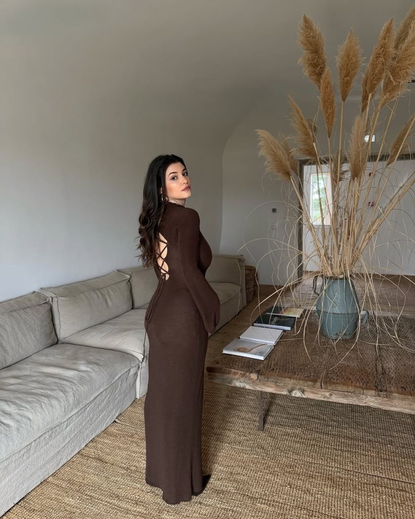 Understated elegance defines this warm brown knit dress—long, textural, and deeply feminine with a bold open-back twist that keeps the look modern.