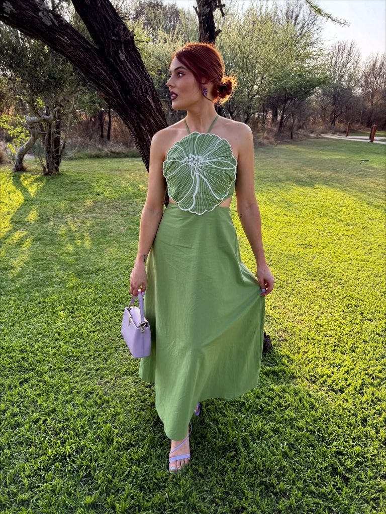 A vibrant, nature-inspired piece that blends artistic flair with breezy comfort. The bold leaf-like applique at the chest gives this Green dress a sculptural quality that feels fresh for 2026.