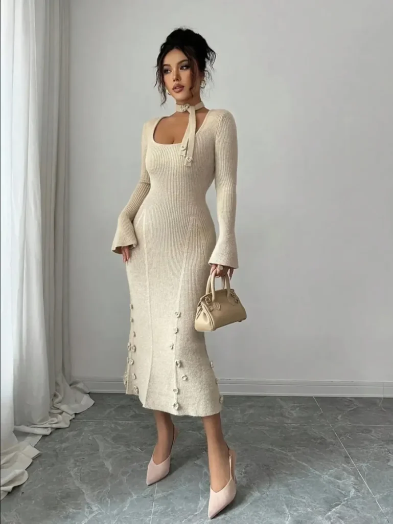 Softly sculpted elegance defines this cream knit midi dress, blending cozy texture with a refined, almost sculptural silhouette.