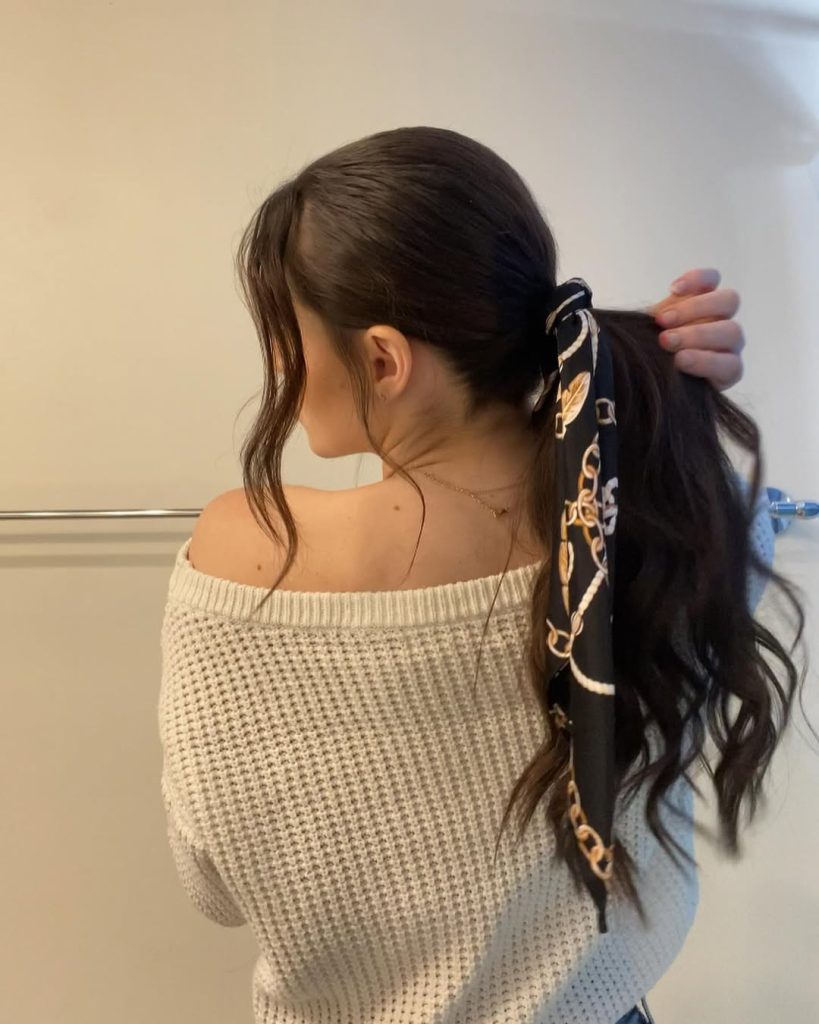 24. A low ponytail tied with a silk scarf creates an effortless, romantic feel that instantly upgrades greasy hair.