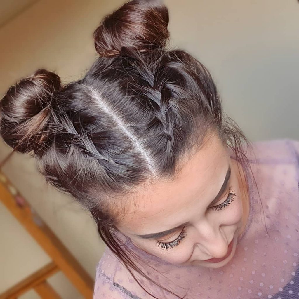 This style works especially well for long hair and is a wonderful option when hair feels very greasy at the scalp. The braids help disguise shine, and the buns keep everything secure, making it practical for busy days. It’s a creative take on braids that turns a bad hair day into something stylish and fun.