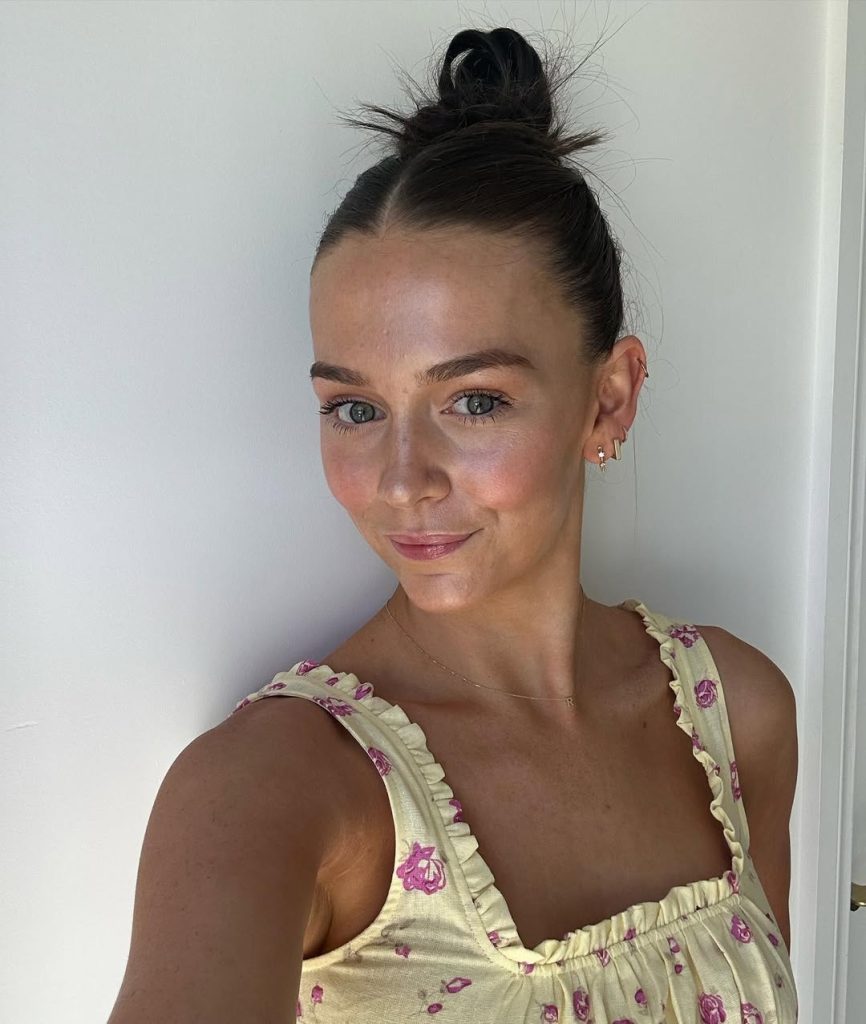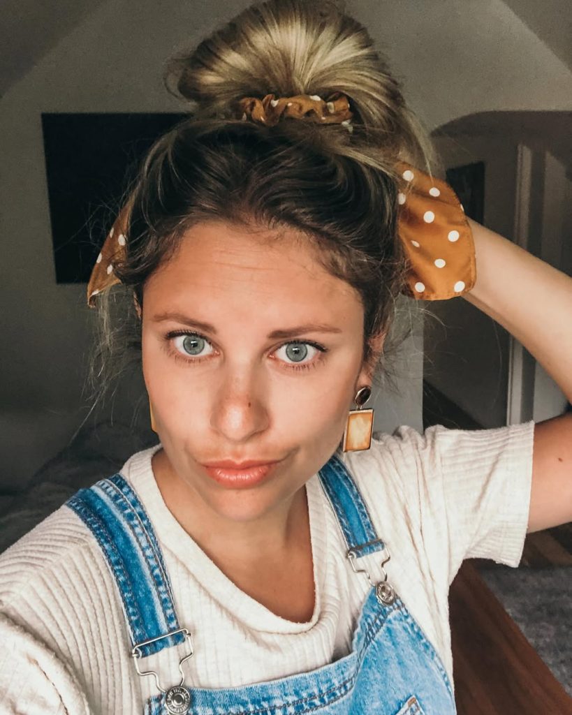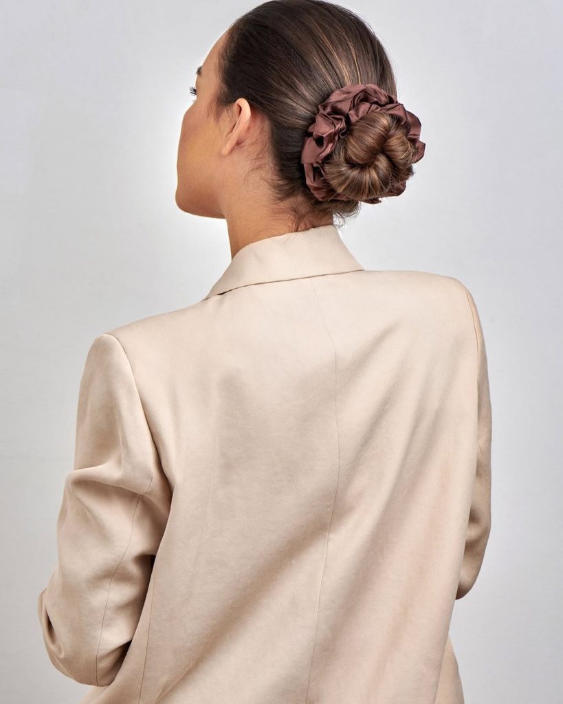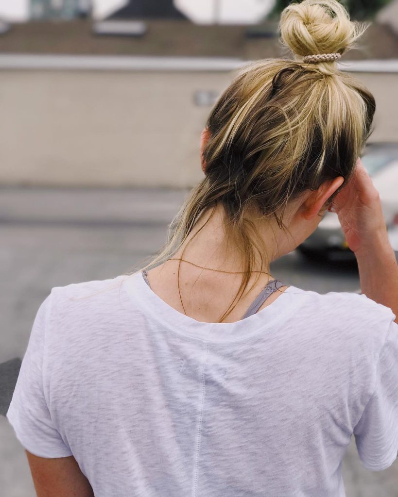 This casual topknot feels playful and relaxed, with just enough structure to look intentional. The scrunchie adds a soft, nostalgic touch that keeps the style from feeling too polished. It’s the kind of hairstyle that feels comfortable and familiar—perfect for days when you want ease over effort.