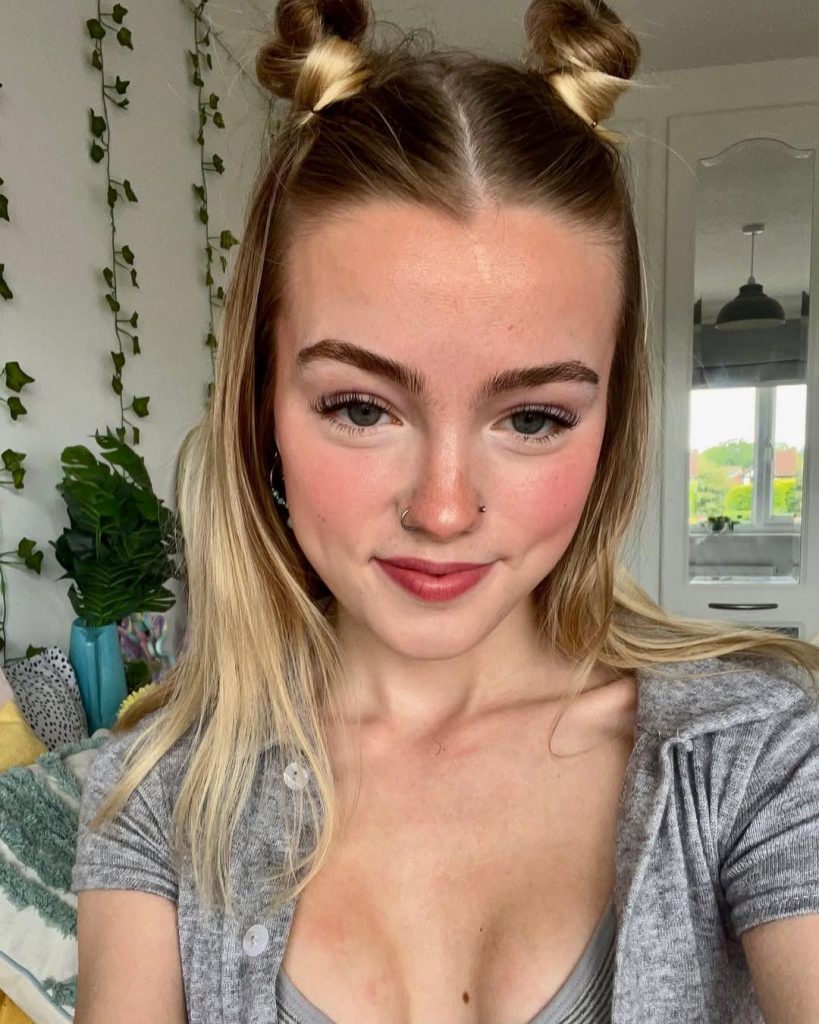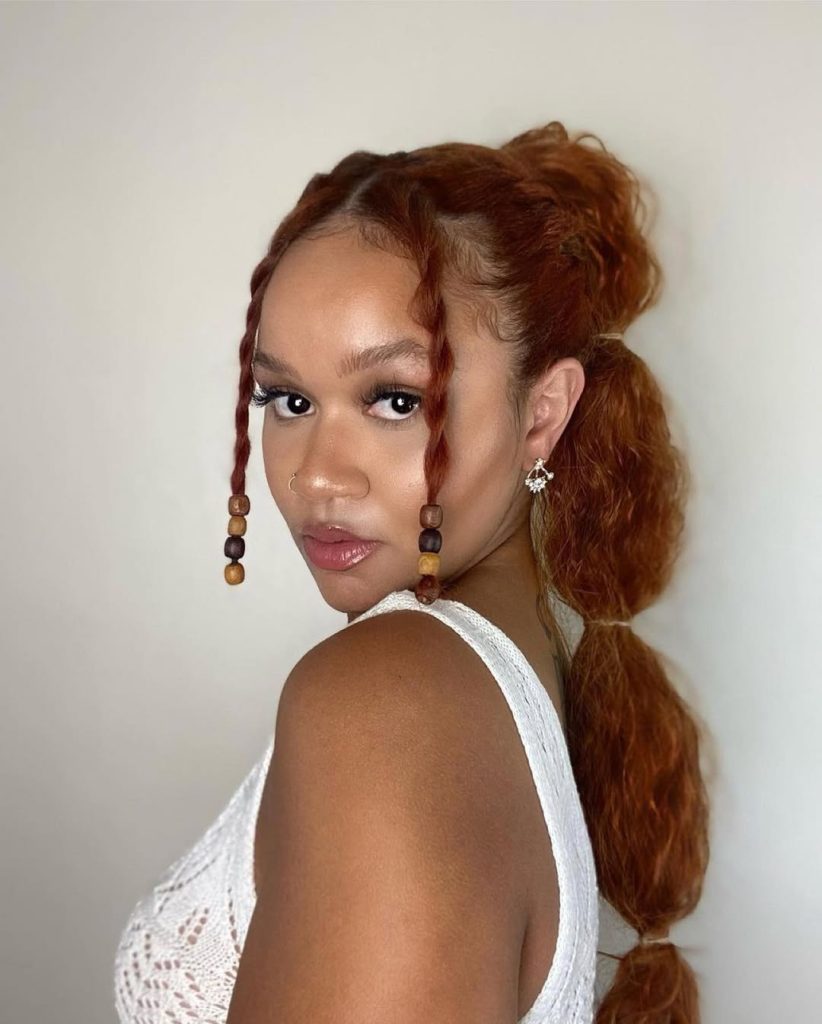 This low bubble ponytail feels playful yet grounded, with soft structure that makes greasy hair look intentional. The small face-framing braids add personality and draw attention forward, while the length stays relaxed and touchable. It’s a look that feels expressive and modern without trying too hard.