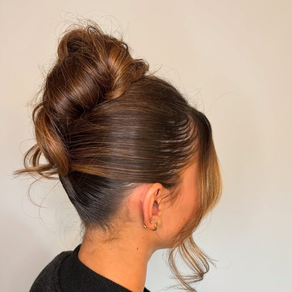 This style is ideal for straight or lightly textured hair and works especially well when hair feels greasy at the roots. It’s a wonderful option for short work schedules or for school mornings when you need something reliable. A smoothing serum enhances the slick effect and keeps flyaways down, making it an effortless updo solution that still looks thoughtful and modern.