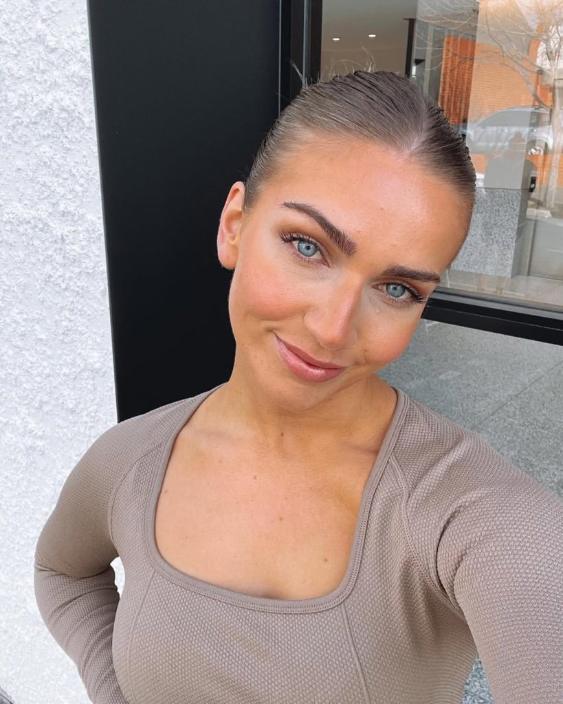 It’s a powerful look to wear a ponytail with slick hair that is not freshly washed. The natural sheen adds polish to this look. The hairstyle appears smooth and maintains a soft, editorial look, with loose hair framing the bottom half of the sign; the pieces that are not facing forward add a softer, more editorial touch.