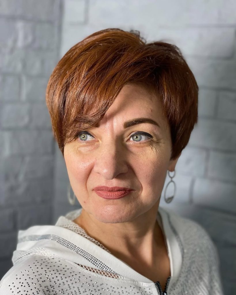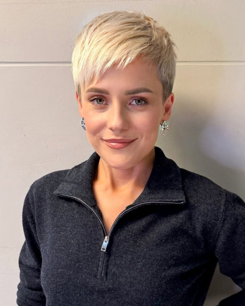 Bright, airy, and full of movement—this layered blonde pixie feels both playful and refined. The gentle volume on top adds lift, while the side-swept fringe frames the face beautifully. It’s effortlessly chic, giving a modern twist to a classic silhouette that flatters at any age.