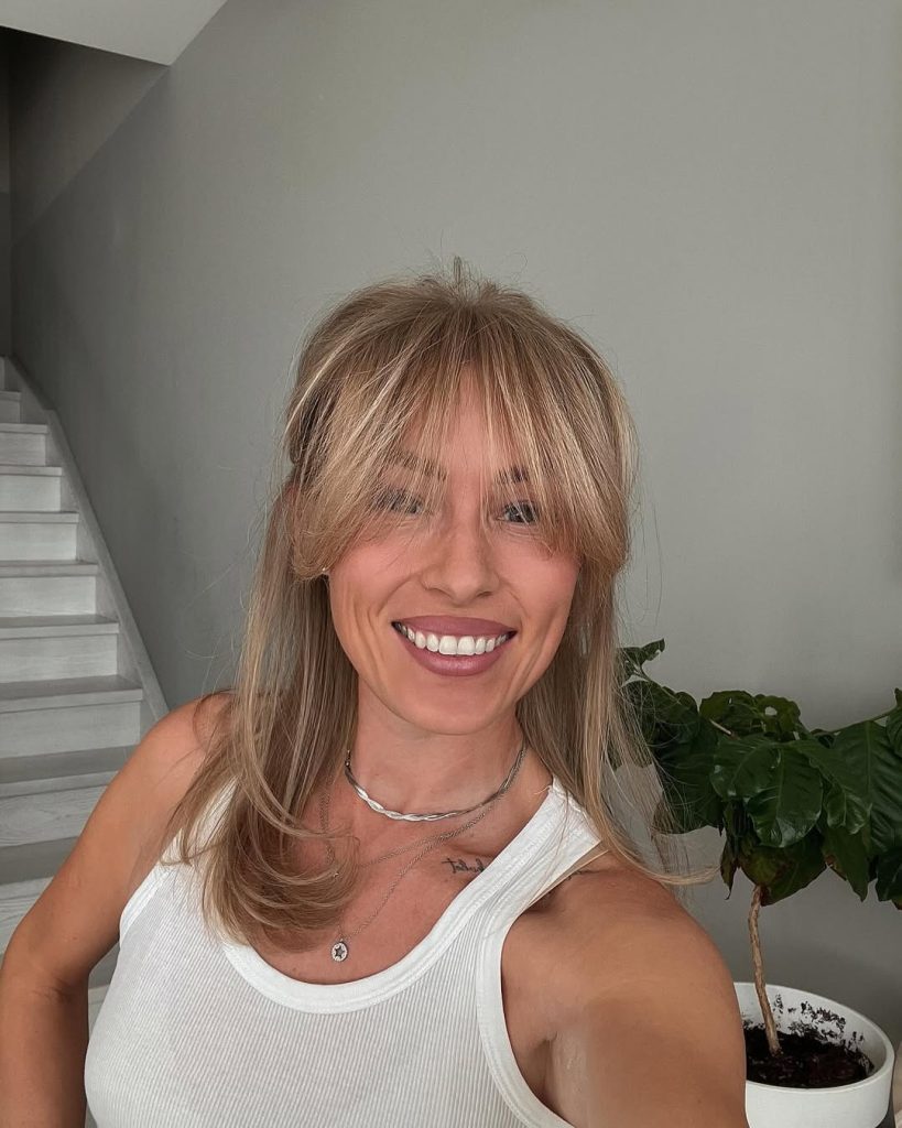This soft medium hairstyle with long curtain bangs brings a gentle, feminine energy—think of it as the modern version of the classic blowout. The layers flow naturally, catching the light and creating a sense of fullness that’s flattering from every angle. It’s graceful, airy, and carries that perfect balance between polished and playful.