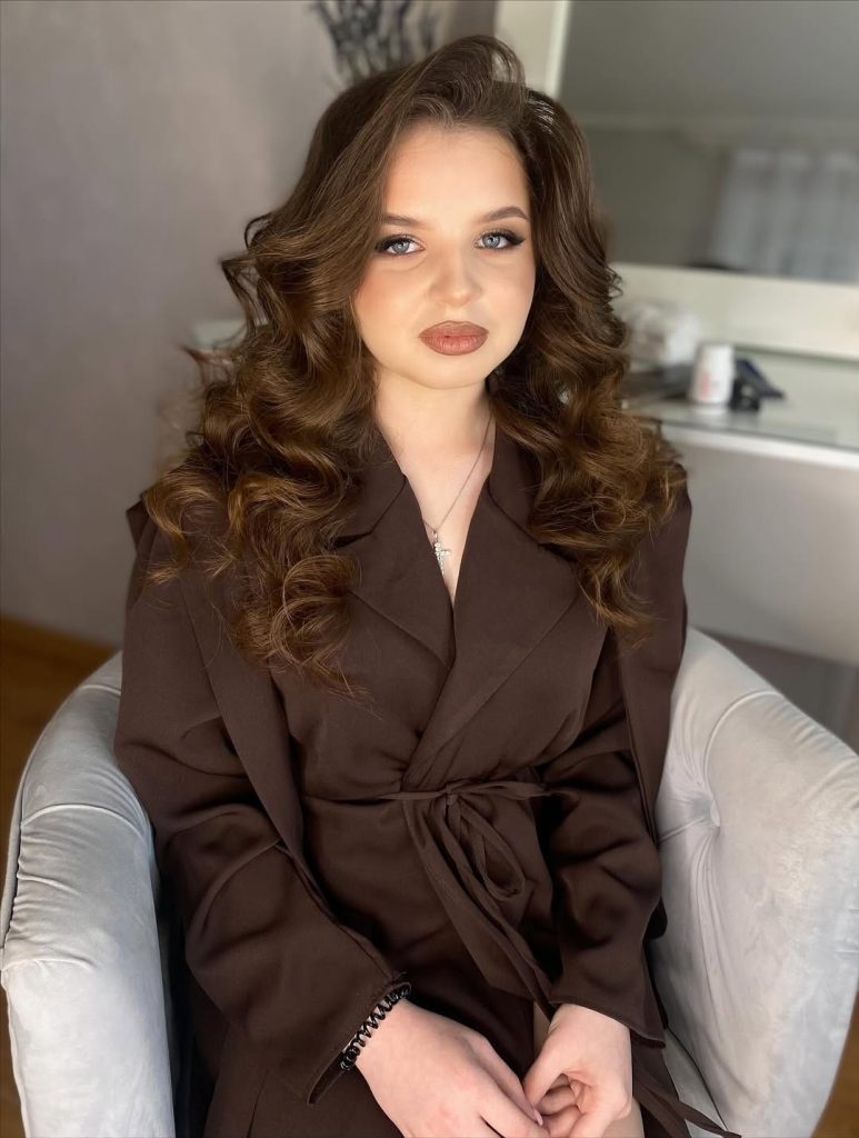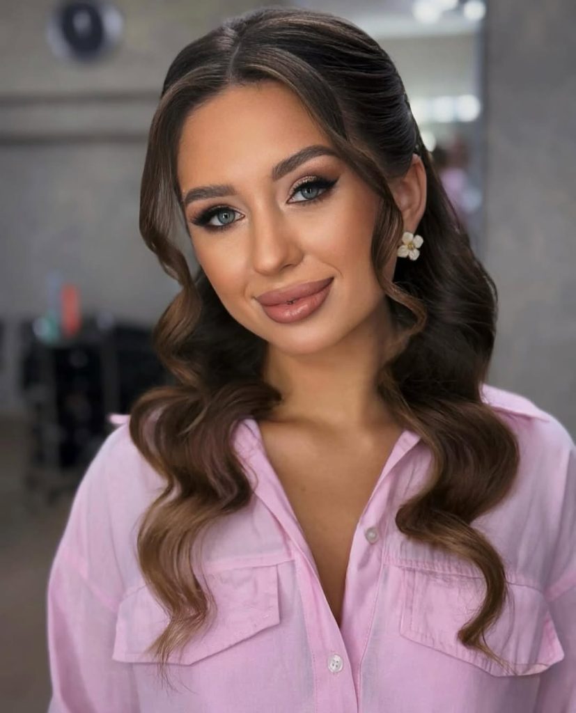 This version is a lovely option if you’re deciding between wearing your hair down or choosing an updo. The lifted crown adds subtle height, which helps balance a round shape, while the loose waves keep everything relaxed. It works well for long hair and mid-length hair and is especially easy to maintain throughout the day. If you want something simple that still feels special, this style delivers.