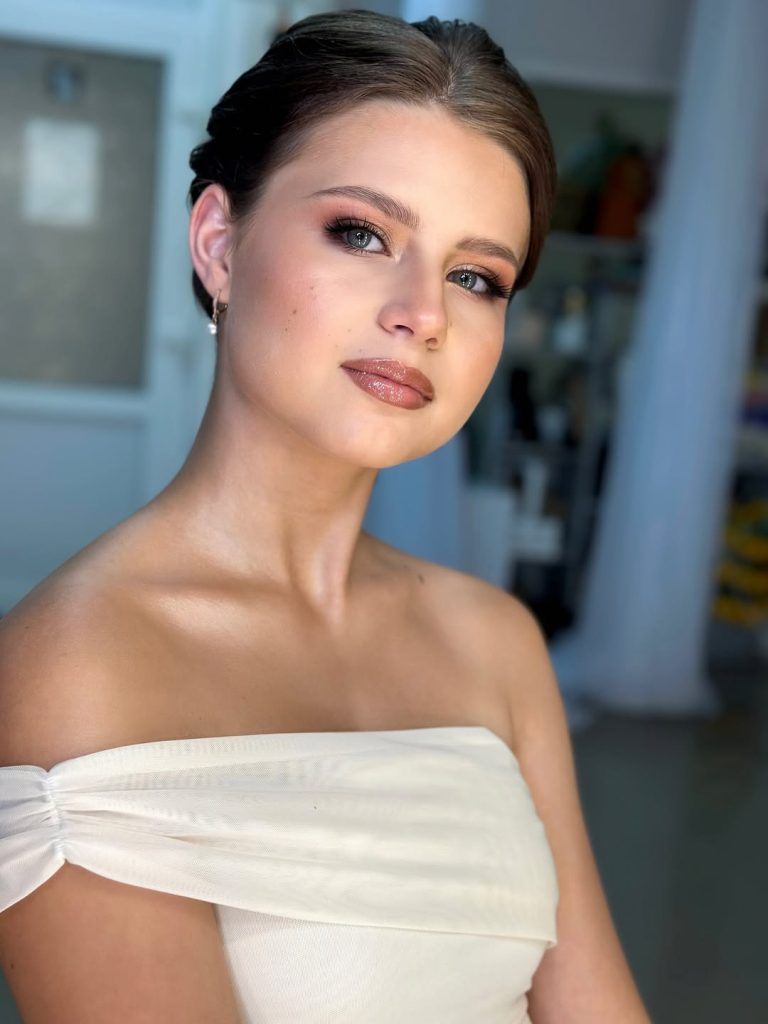 A clean bun like this is perfect for wedding events, bridal moments, or even a polished bridesmaid look. It works well on medium- to long-length hair and is especially helpful for round faces because the height at the crown elongates the profile. This updo is secure, neat, and easy to refresh throughout the day, making it a smart choice when you want beauty without constant touch-ups.
