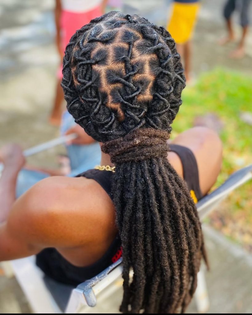 This half-up braided dreadlocks hairstyle with beautiful barrel twists on the crown combines sophistication with ease of wear. The roots are pulled back in an elegant manner, with lovely designs being created, while the remainder of the dreadlocks is left to flow freely down the back.
