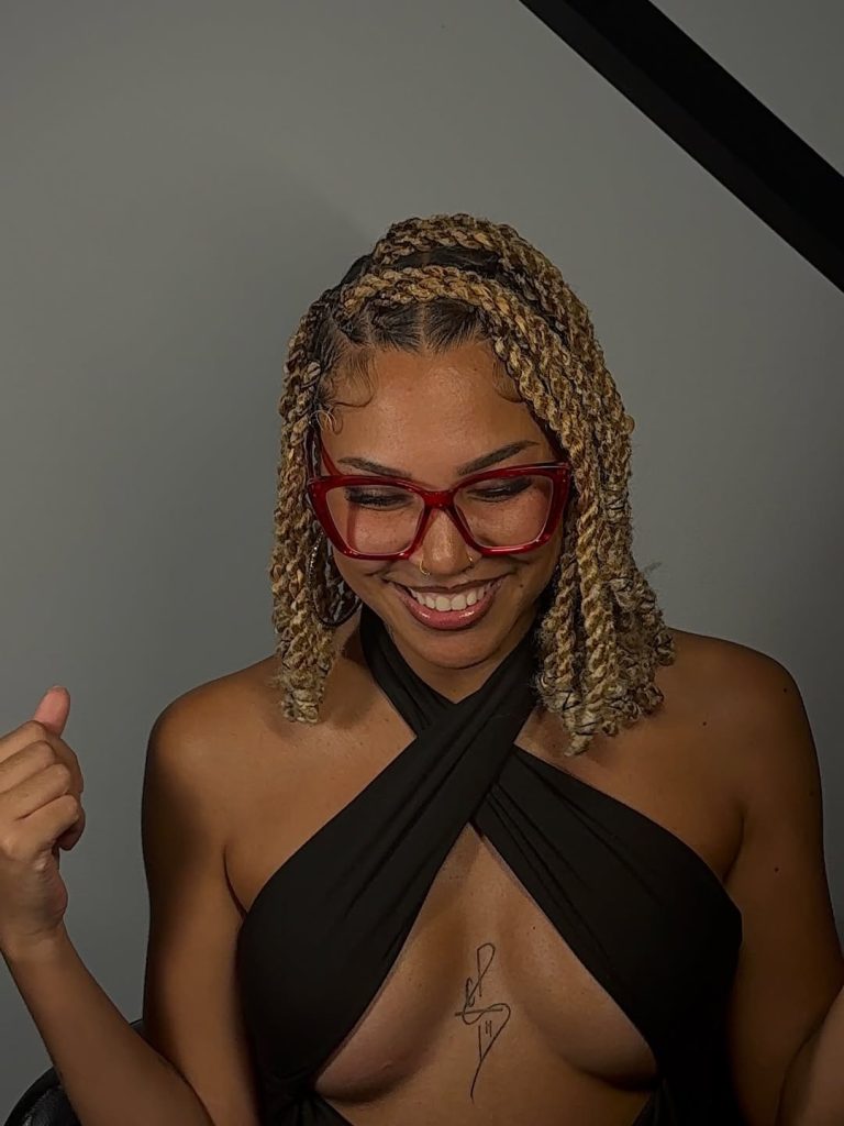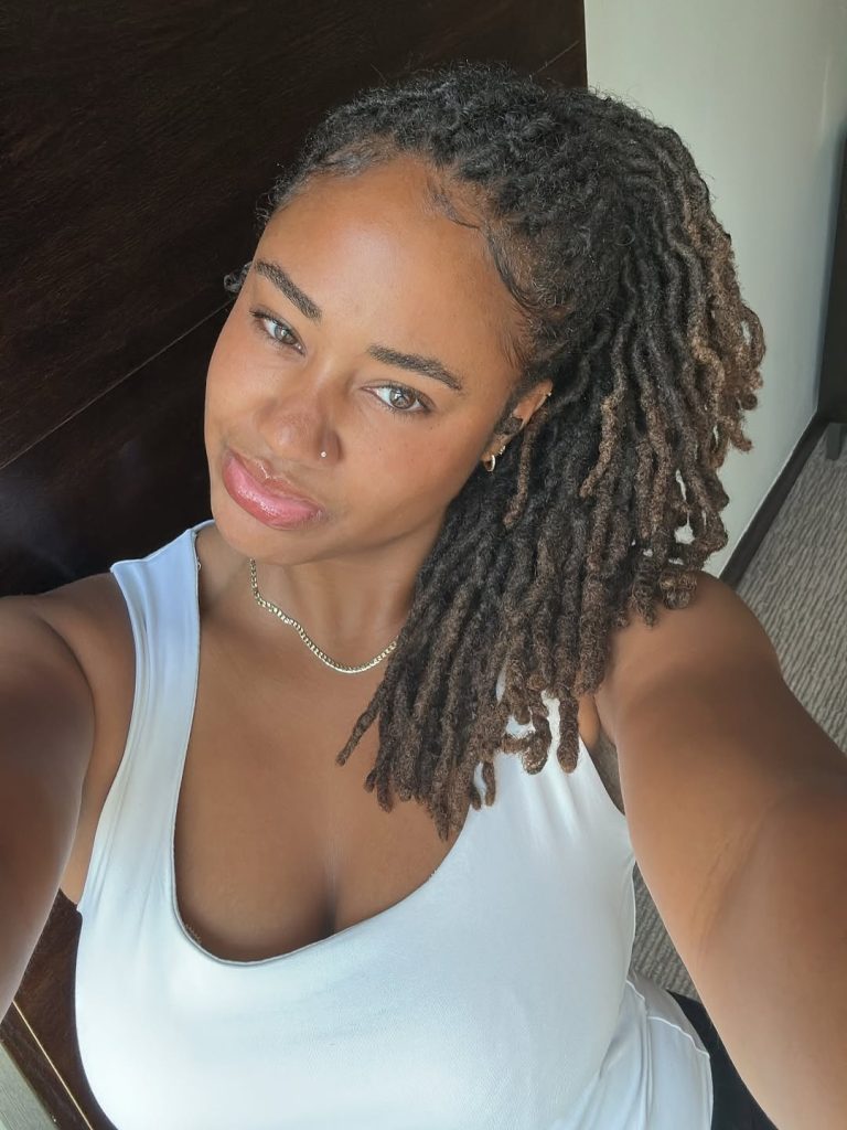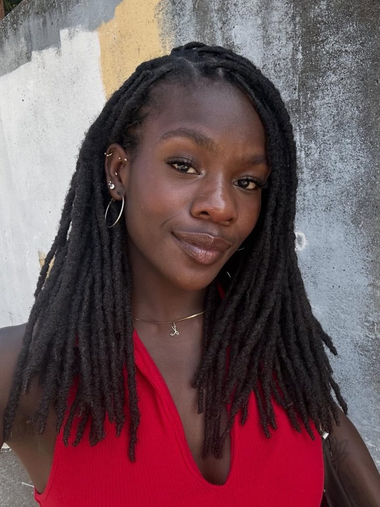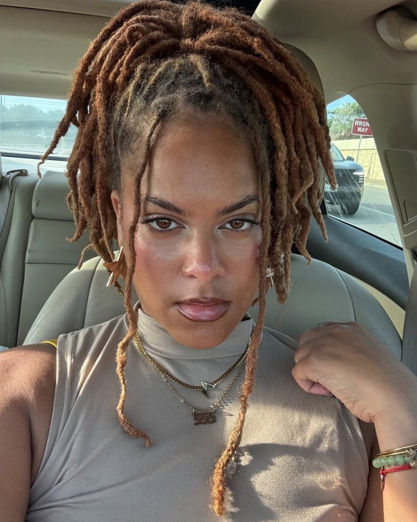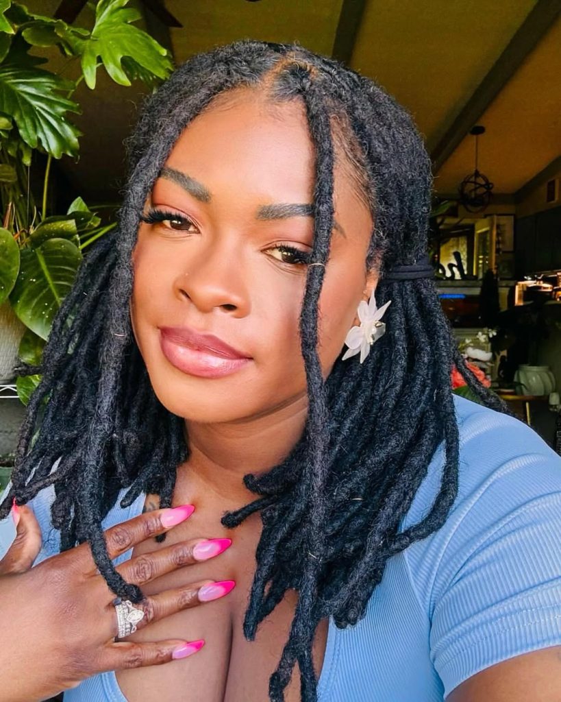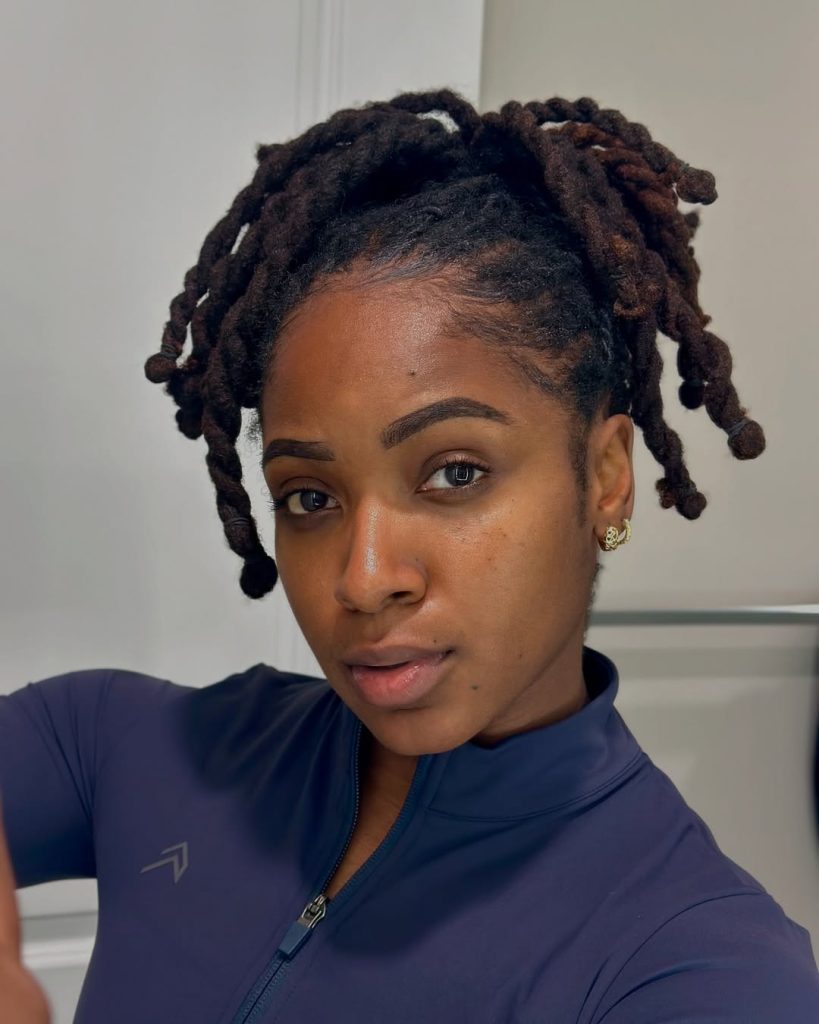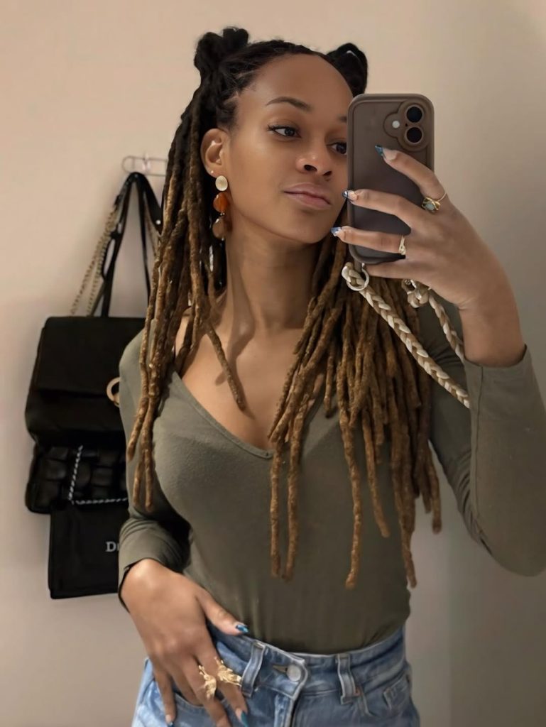 A short high ponytail with thick locs gives off a playful, sporty vibe. The strands fall in different directions, adding texture and energy to the look. It’s a hairstyle that feels youthful, fun, and ready for anything.