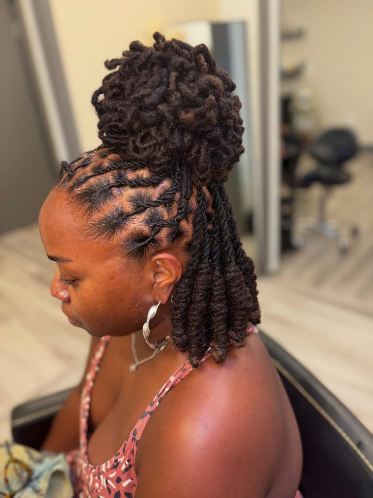 This hairstyle is best for medium-length locs and works well with natural hair that needs both sleekness and texture. The braided sections are easy to maintain, while the curls allow you to rock a softer look that is perfect for day-to-night wear.
