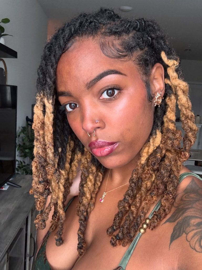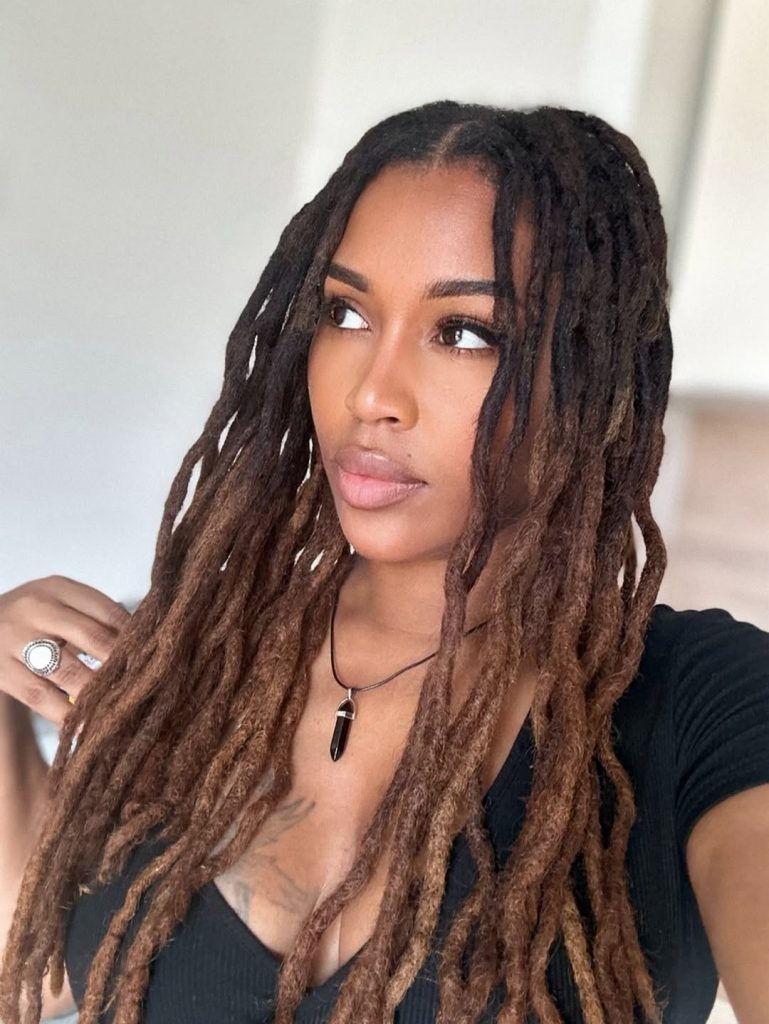 Long ombre locs bring a soft yet striking edge to any look, blending rich dark roots with golden-brown ends that catch the light beautifully. The result is an effortless flow of color that feels bold but wearable, giving your style a modern update while still honoring the natural charm of dreadlocks. It’s the kind of look that turns heads without even trying.