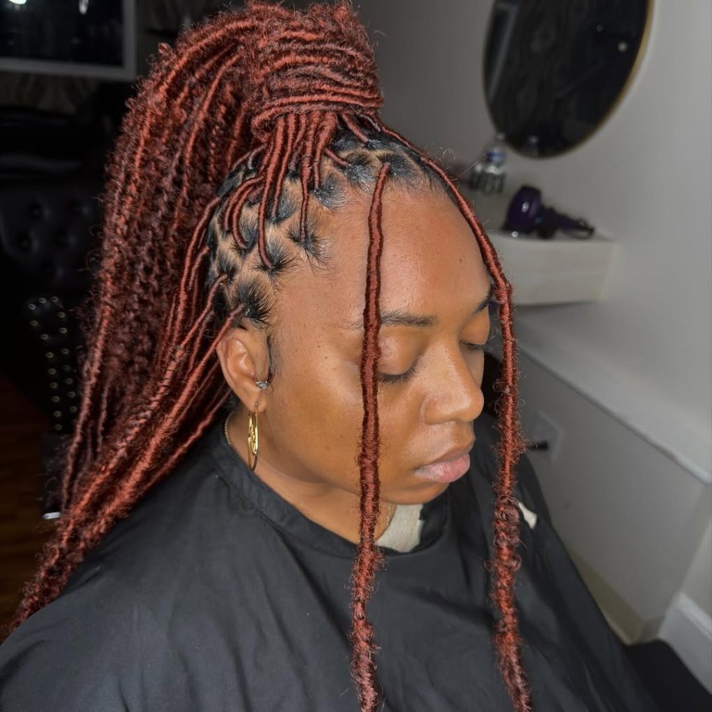 Two-tone locs are known to be full of creativity and individuality, something that stands out in any setting because of the stark contrast between the nice oranges on the front and the deep burgundy on the back sections of the hair.