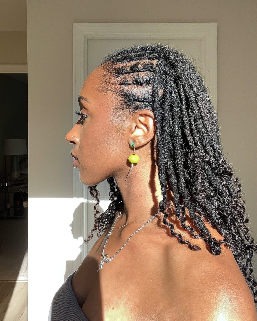 This is one of the most versatile styles, where side braids are done in combination with curly locs at the end, giving it an even more lively look that stands out in the best way possible.