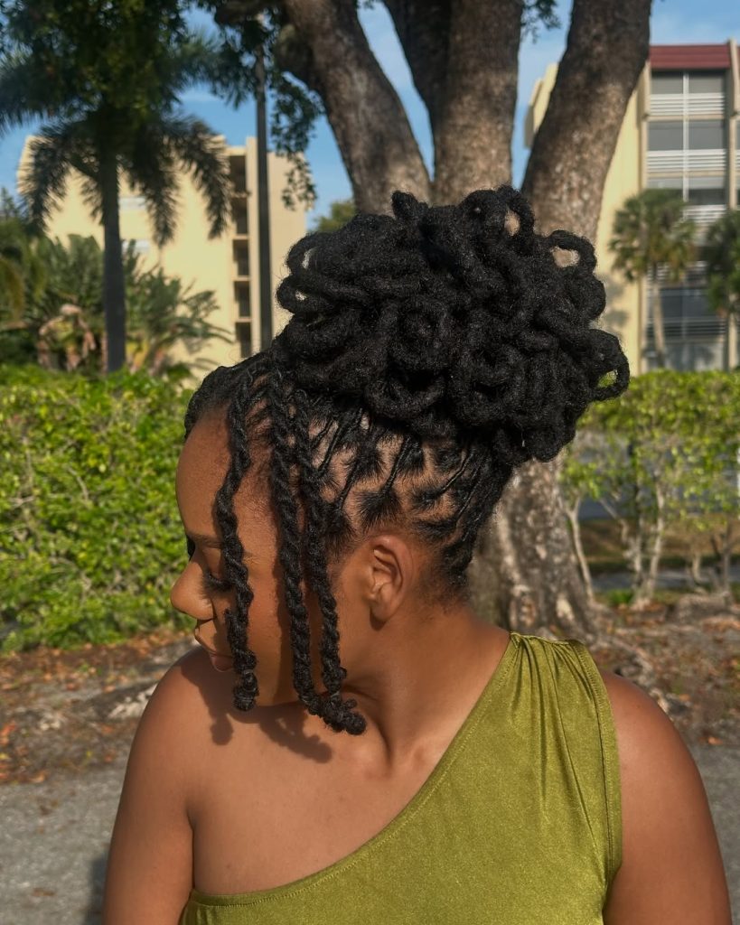 This look works best for medium to long locs, especially if you enjoy updos that hold well and stay neat. It’s a great option for formal events but still wearable for everyday life. With its clean retwist and dramatic bun, it offers the best of both polish and personality.