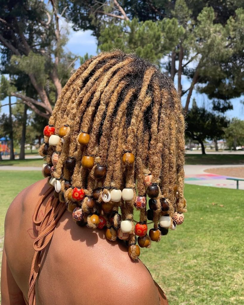 This styling option is most flattering on short- to medium-length locs because the beads are heavy enough to swing back and forth with each motion of the walk. It is one of the best styling methods for women who enjoy playing with different styling tools but still enjoy low-maintenance locs. The result is simply effortless because it gives you one hundred percent of your own inherent styling with your locks.