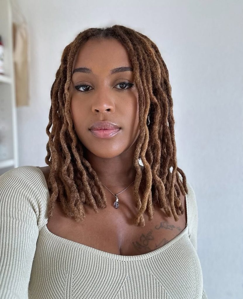 A shoulder-length bob with locs has an undeniable freshness to it—chic, versatile, and easy to style for any occasion. The light brown shade adds warmth, while the blunt cut keeps everything neat and structured. It’s a hairstyle that feels both youthful and grown-up, giving you that sweet spot of balance.