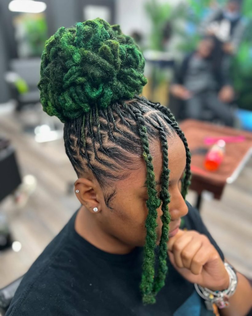 This green loc updo is nothing less than stunning, with so many personalities packed together in one single hairstyle. The base is crafted in terms of the barrel twist, while the green locs reside on top in a stunning emerald hue. The final effect is completed by leaving some locks loose on the face sides, making it very artistic yet feasible to sport.