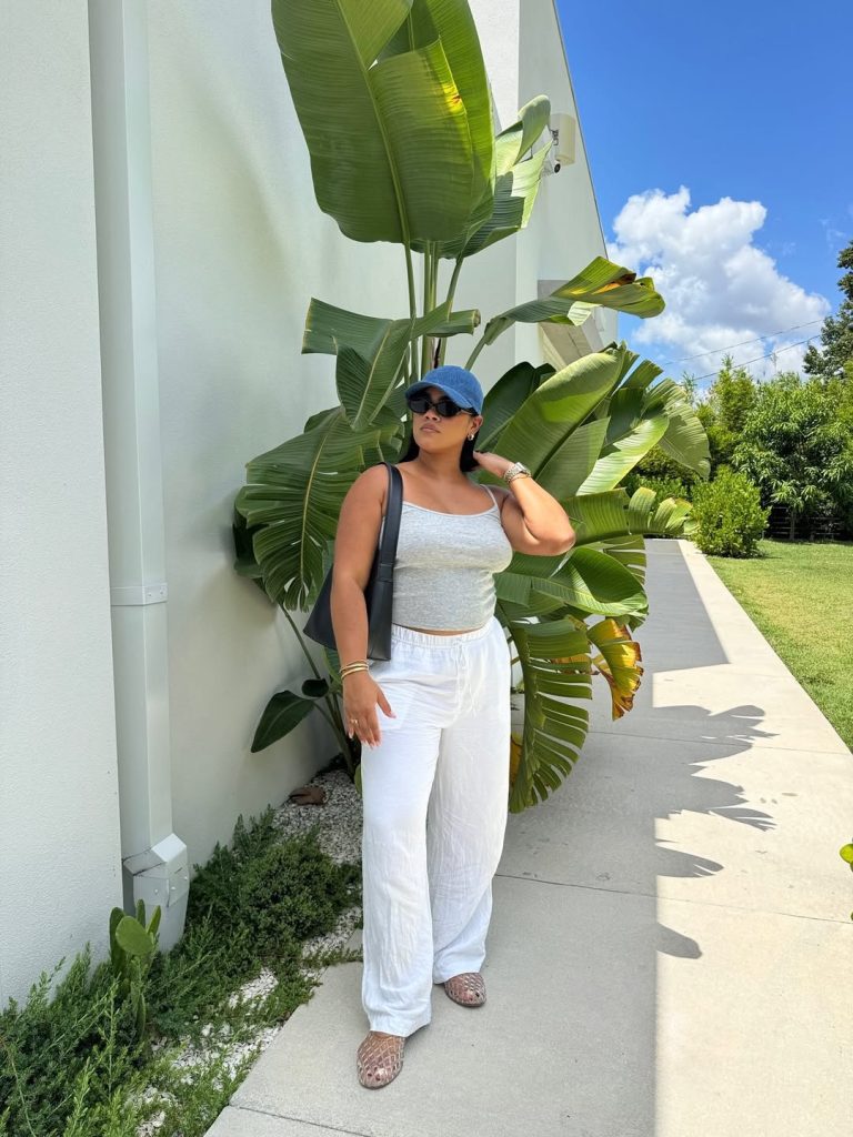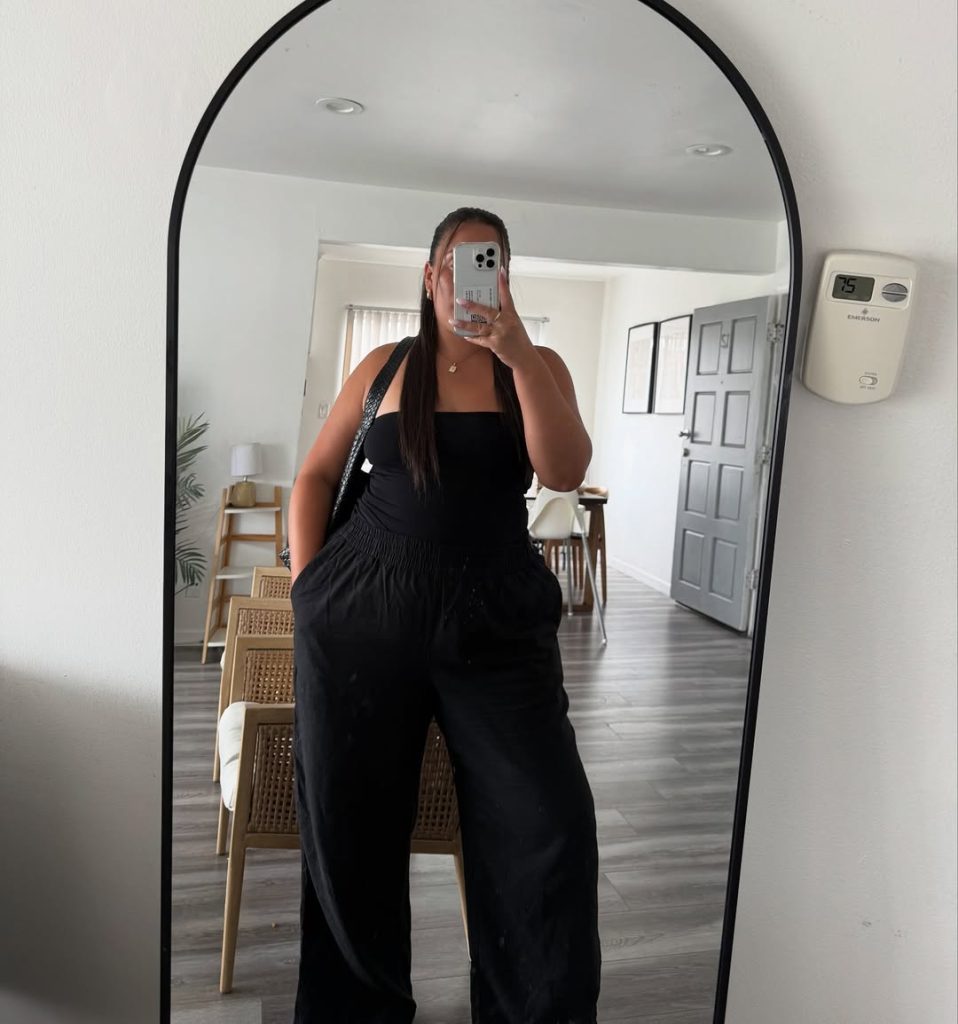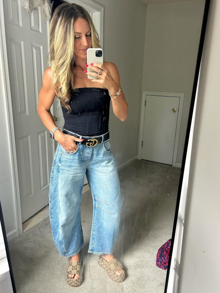 It’s the kind of look that turns a coffee run into a soft, editorial-worthy moment. Add a sleek low bun or a classy trench for cooler days. Skip bold sneakers—the look thrives on flow. Ideal for spring shopping trips, travel days, or a slow summer Saturday with iced coffee in hand.