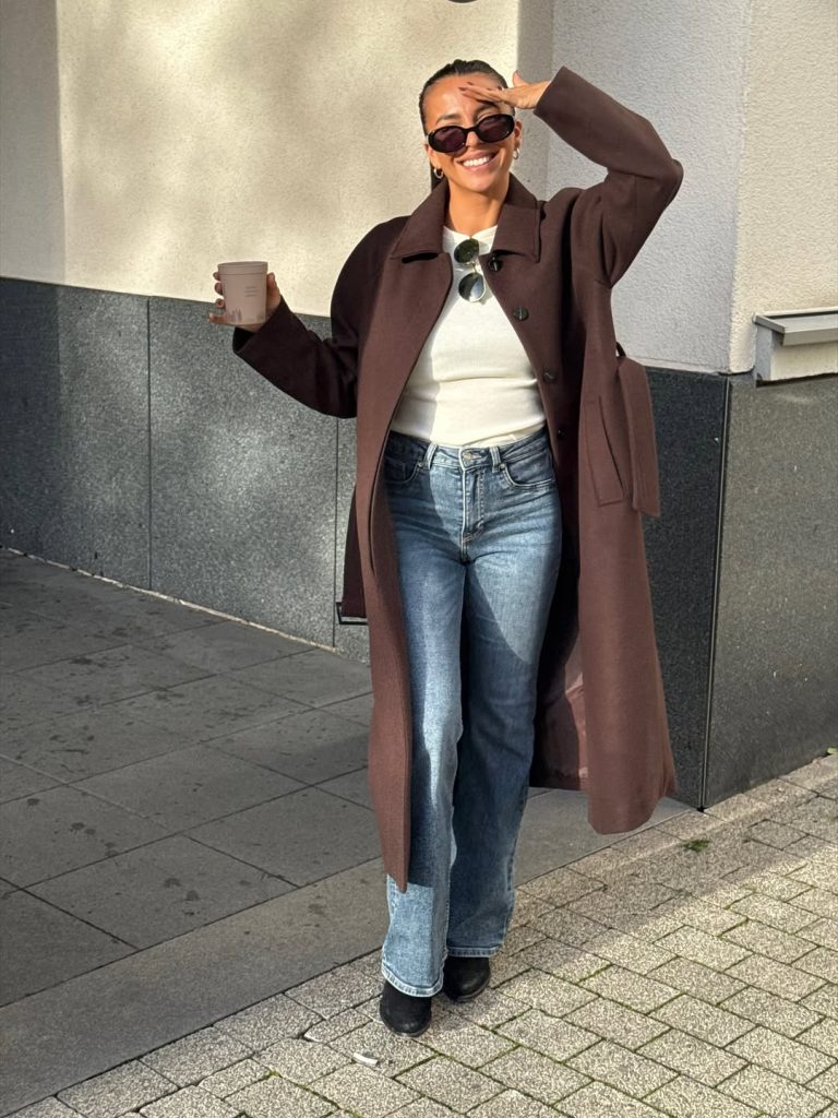 A relaxed yet polished blend: a rich brown overcoat layered over a fitted cream top, paired with mid-wash jeans—a look that fits the everyday mom who values comfort but never sacrifices personal style.